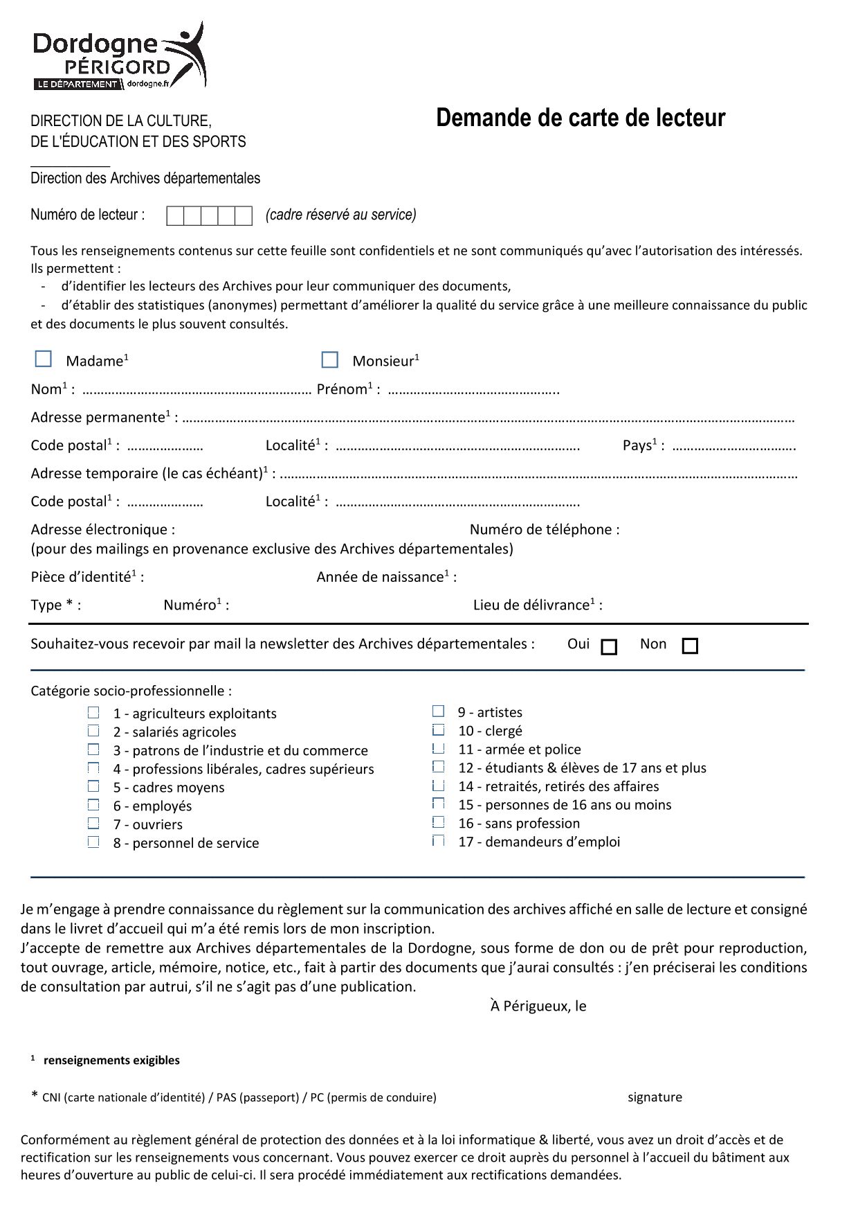 Vous pouvez pré-remplir la fiche de renseignements (voir fichier ci-dessous) pour l'obtention d'une carte de lecteur.
