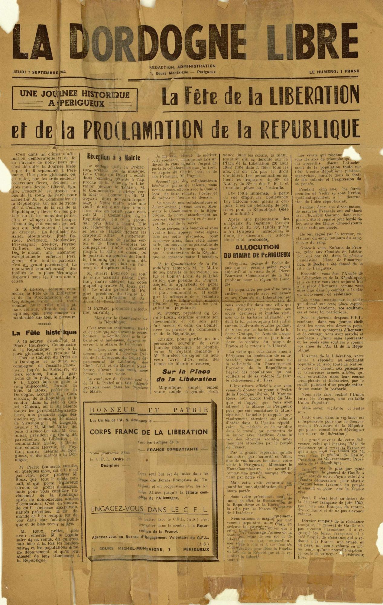 La presse de la période 1939-1945 s'enrichit de nouveaux numéros : les premiers numéros de la Dordogne Libre (septembre à décembre 1944) ont été numérisés et sont en ligne.