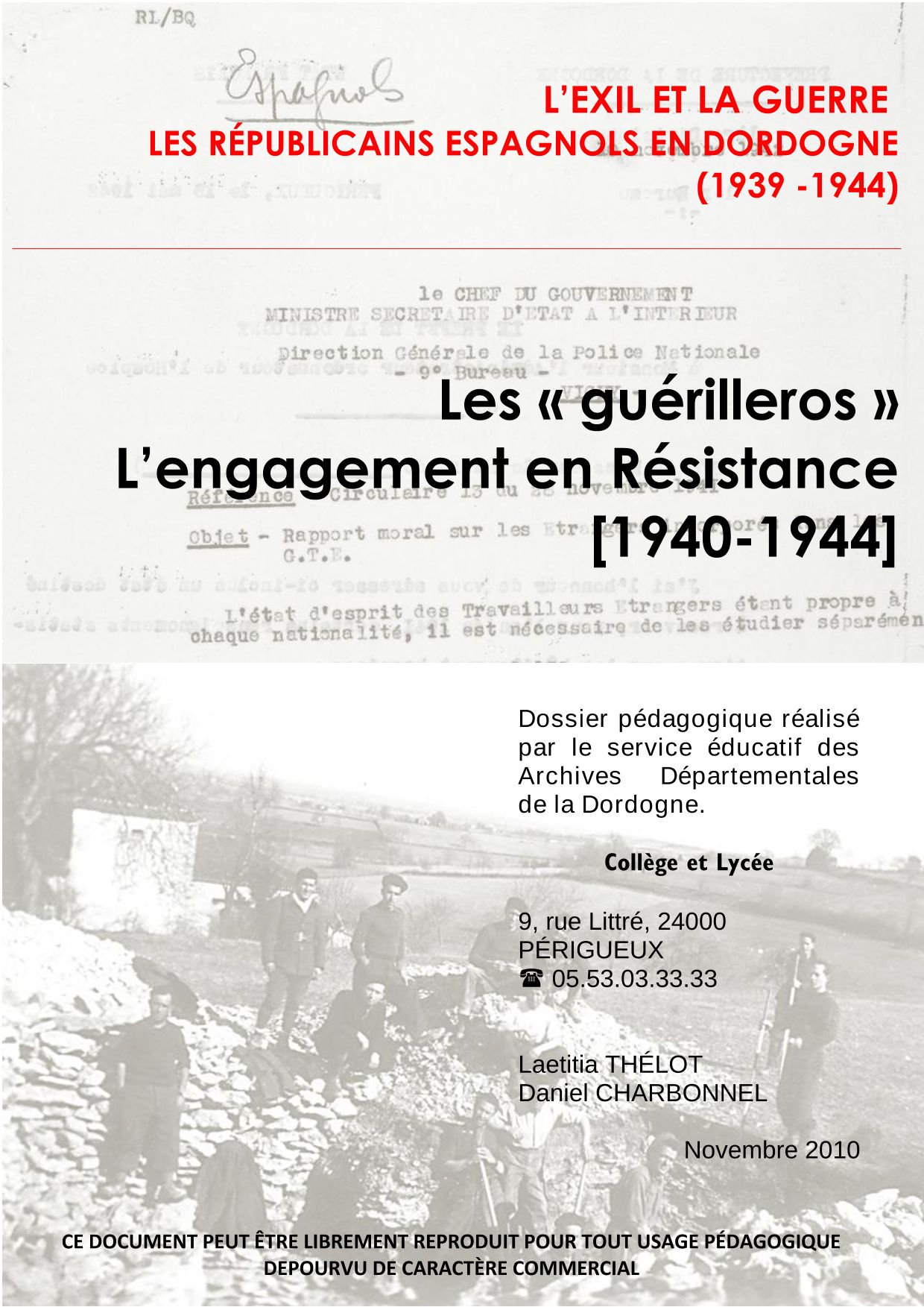 Les guérilleros, l'engagement en Résistance, 1940-1944 12 pages,novembre 2010(collège, lycée). Consulter le dossier (2.3 Mo)