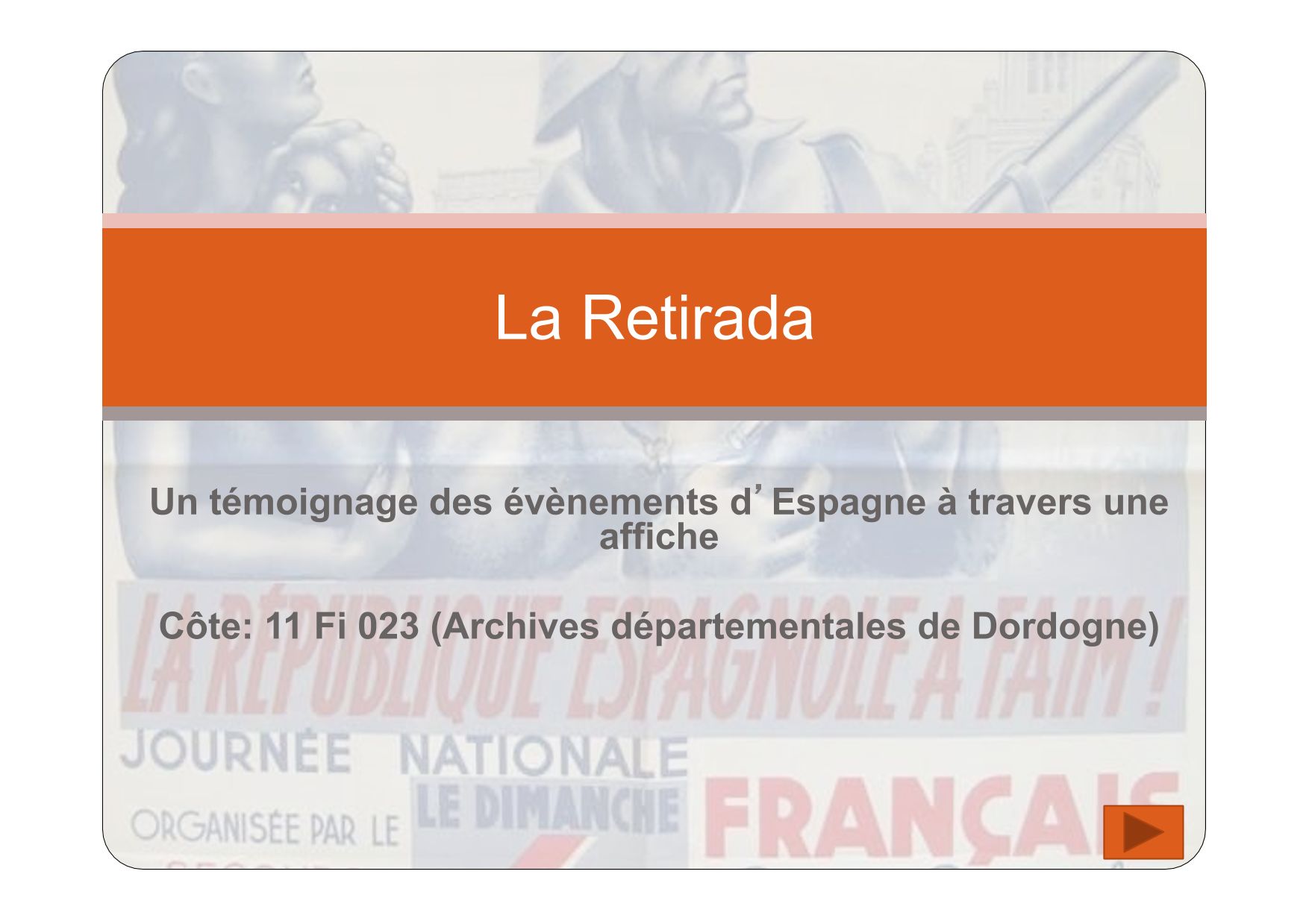 La retirada La retirada Un témoignage des évènements d'Espagne à travers une affiche - consulter le diaporama (11 Mo, .PPT) 17 dispositives, novembre 2010(collège, lycée). Consulter le diaporama (2.8 Mo)