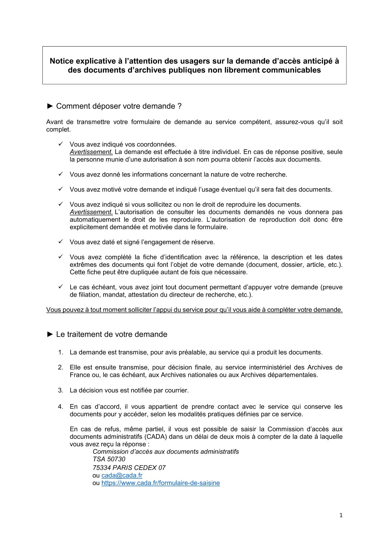 Lorsqu’un refus implicite ou explicite à une demande d'accès aux archives publiques est opposé au lecteur, ce dernier peut saisir la Commission d’accès aux documents administratifs (CADA) dans un délai de deux mois à compter de la réponse à sa demande de dérogation. Il est nécessaire de présenter ce recours soit par courrier (20 avenue de Ségur 75007 PARIS), soit en passant par le formulaire de saisine présent sur le site de la CADA.