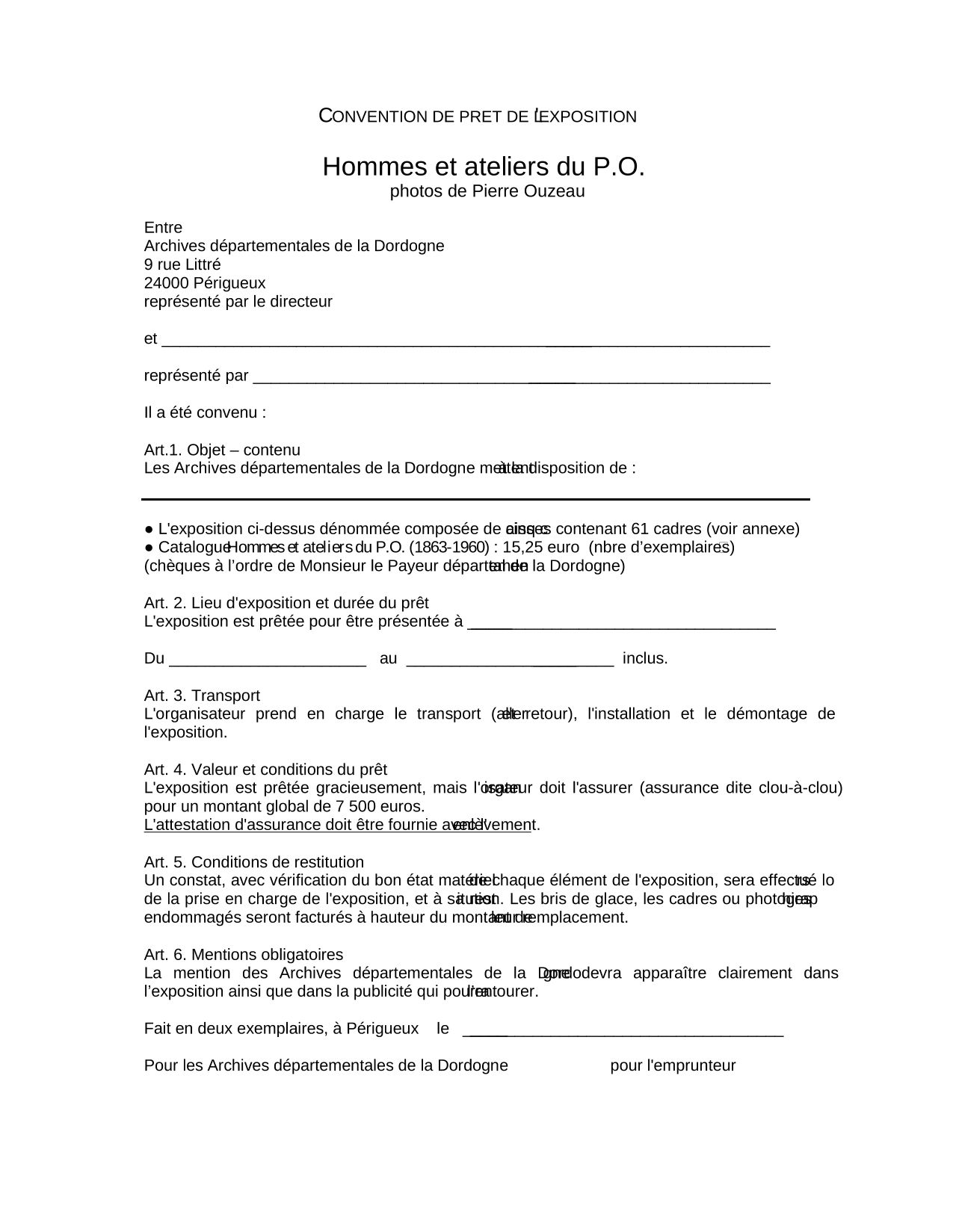 Établissement d’une convention de prêt entre les Archives départementales et l’organisateur.