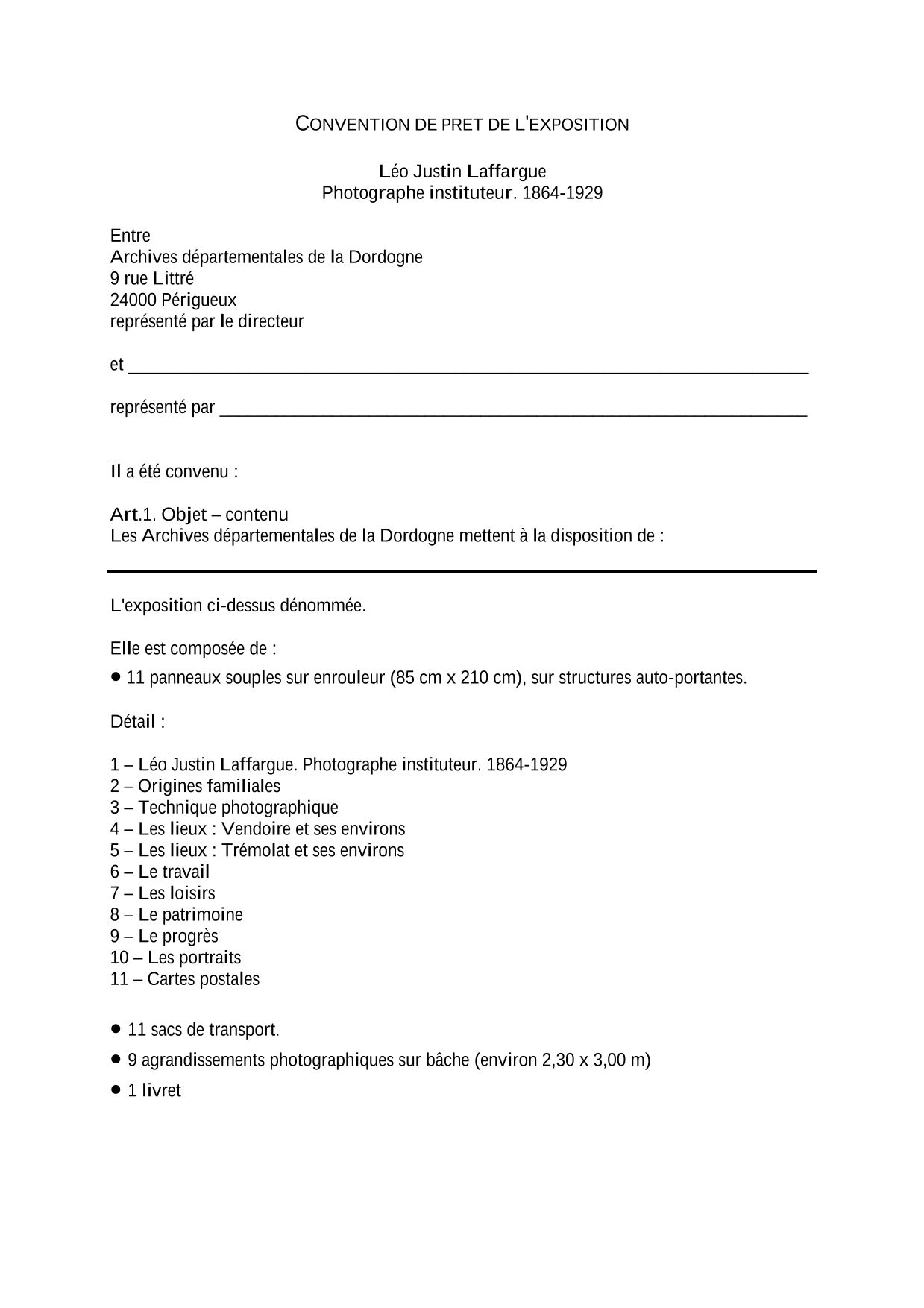 Établissement d’une convention de prêt entre les Archives départementales et l’organisateur.