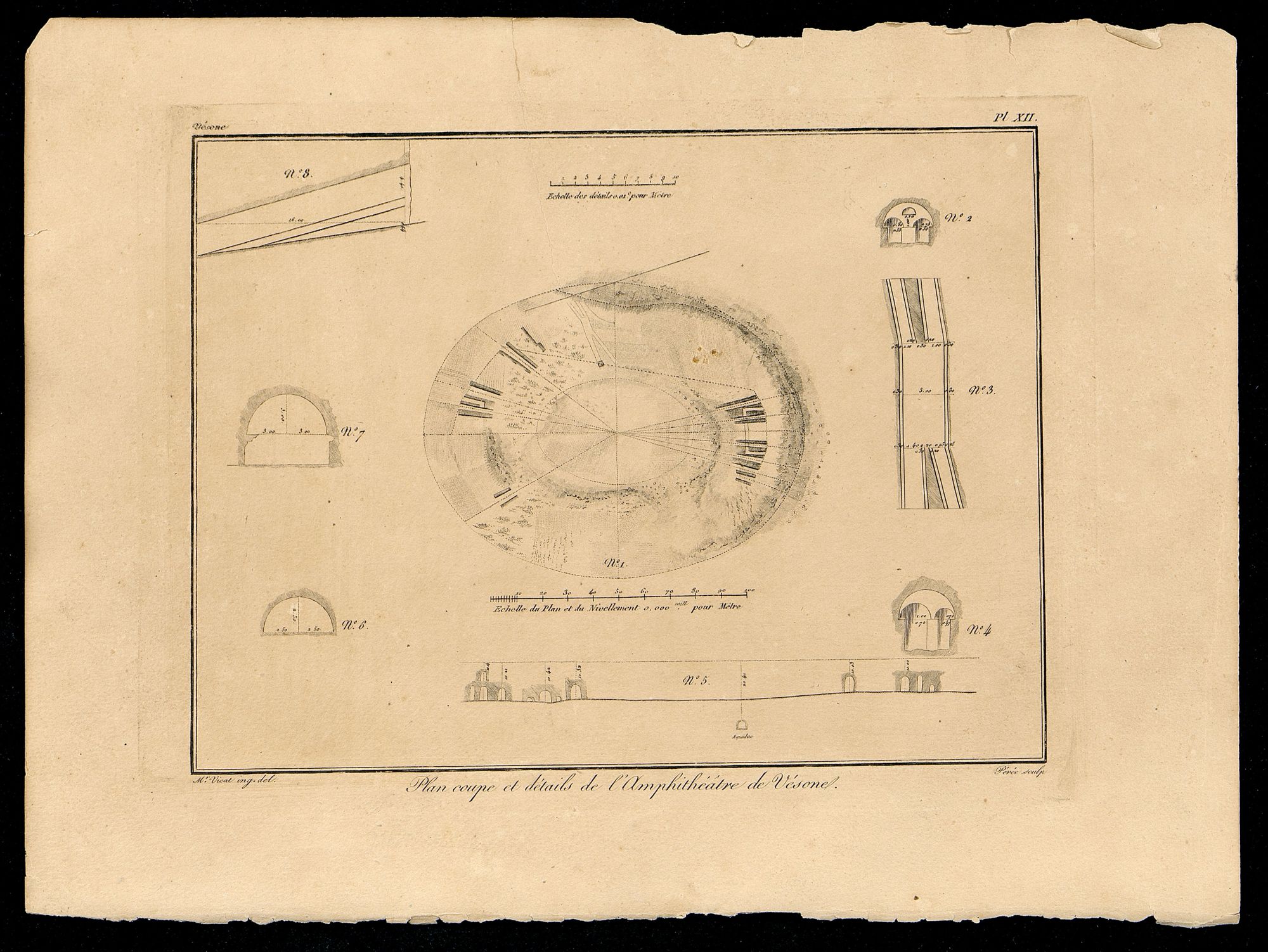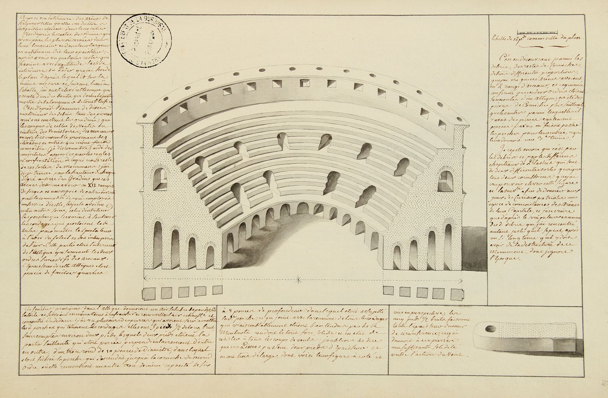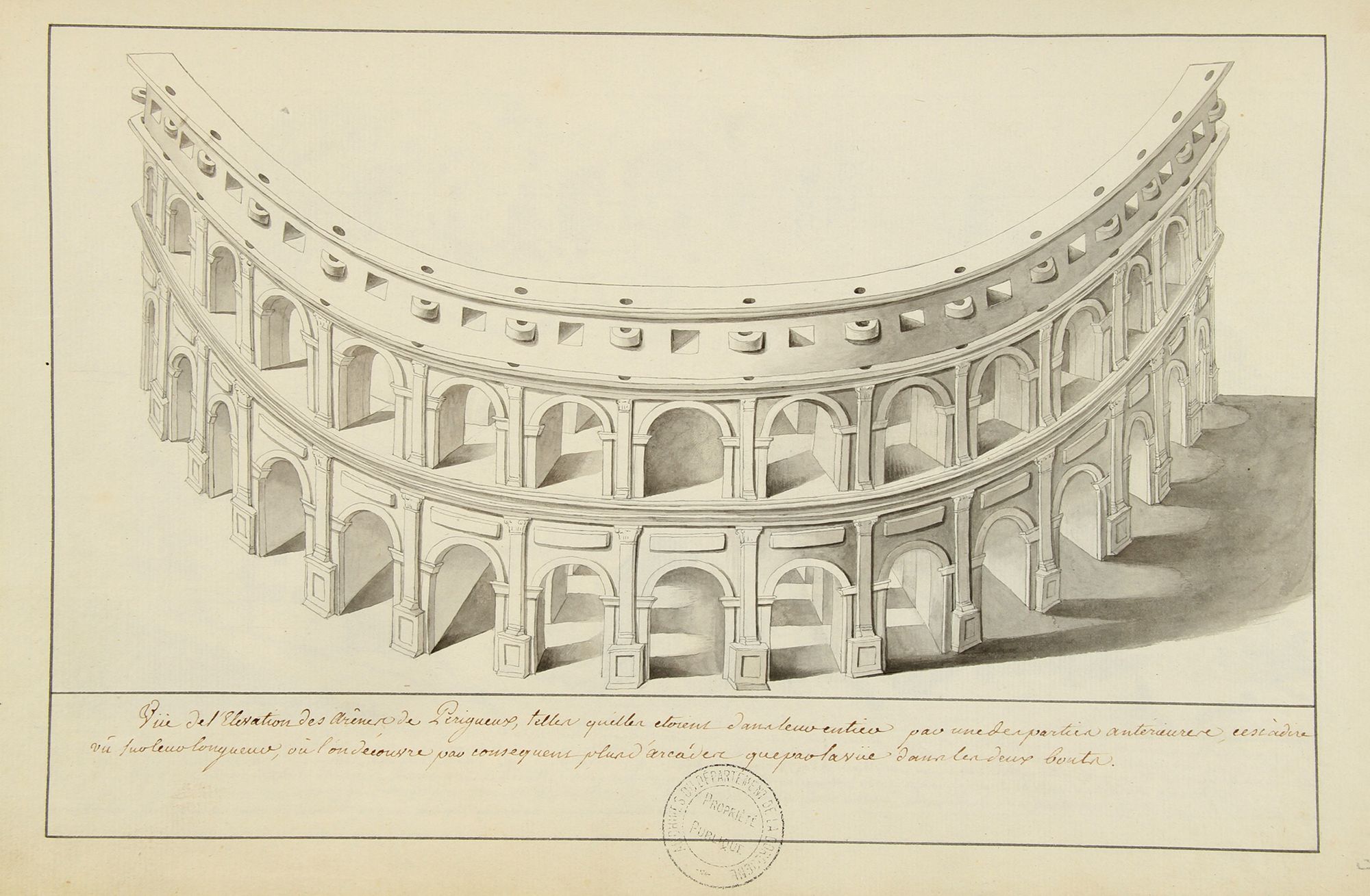 "...De ses passages à Périgueux il adresse deux rapports à l’Académie des Inscriptions et Belles Lettres, l’un pour ses séjours en 1763 et 1772, l’autre pour 1783. L’amphithéâtre y fait l’objet de quatre planches : une vue cavalière qui montre l’ensemble des vestiges, un plan simplifié, et deux restitutions de l’élévation, intérieure et extérieure."