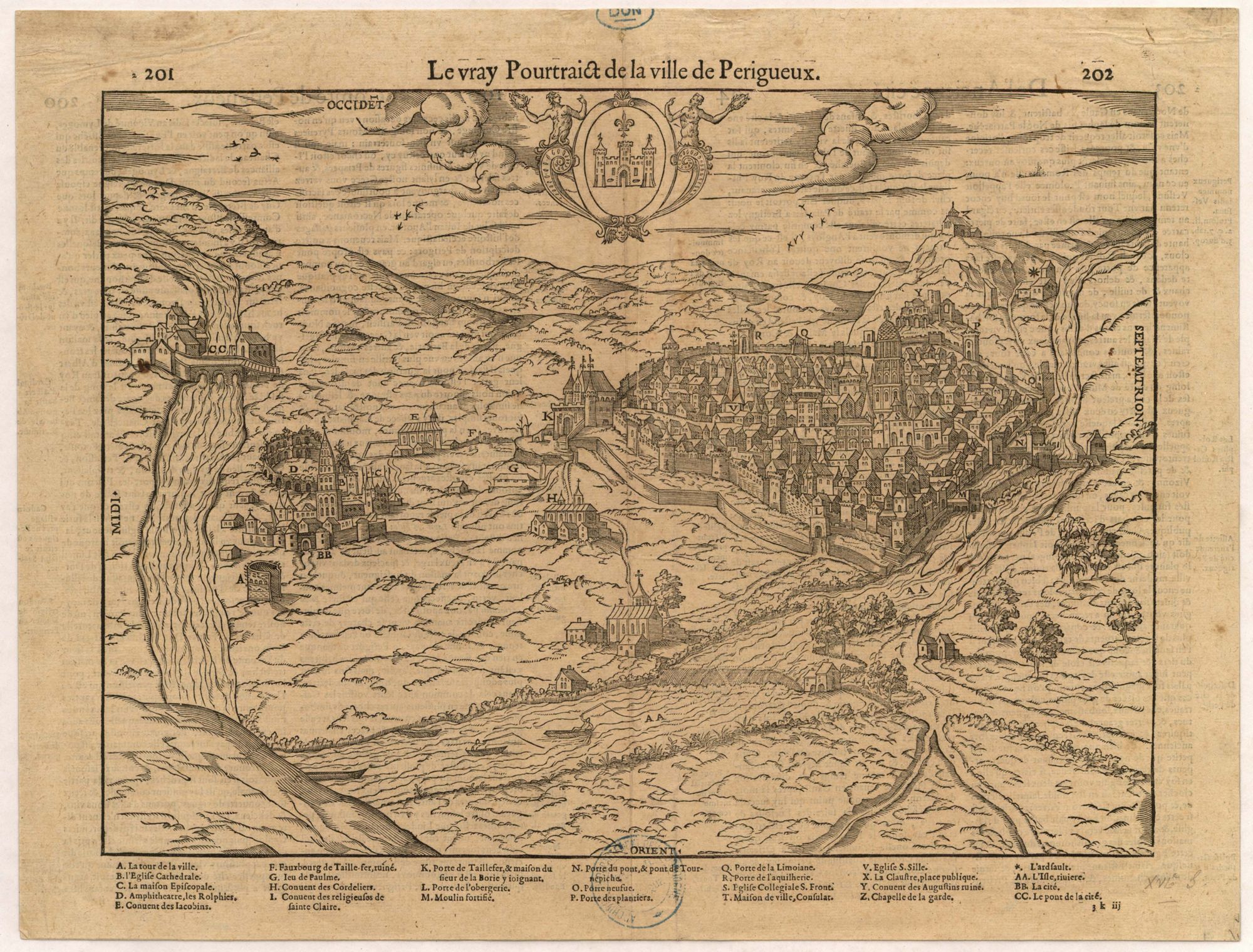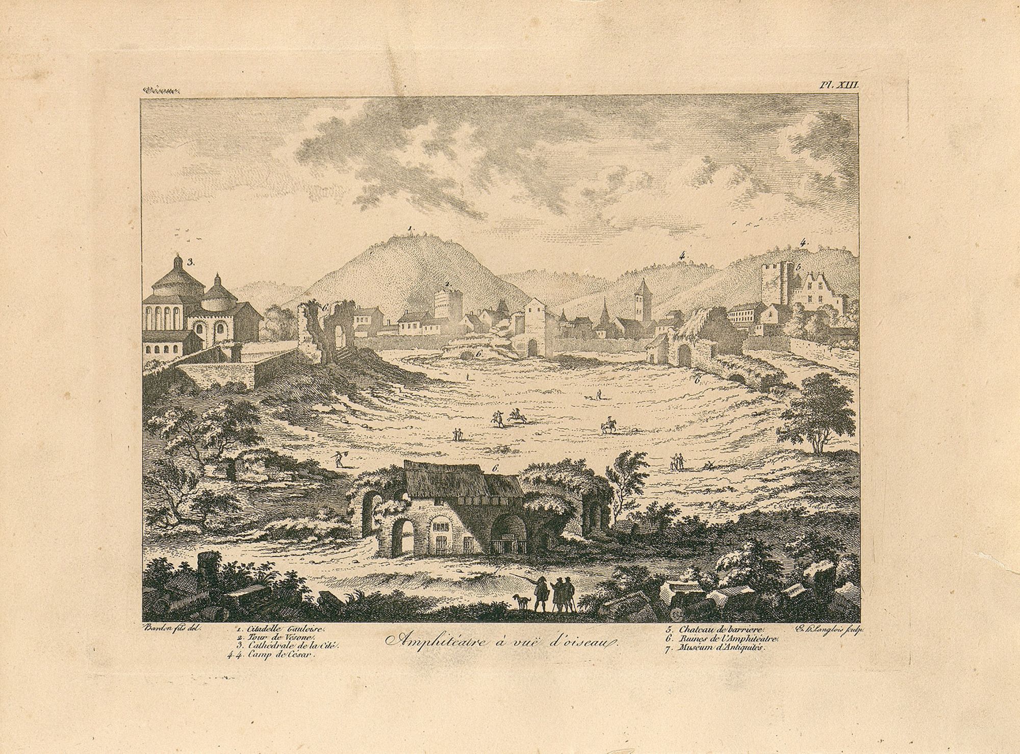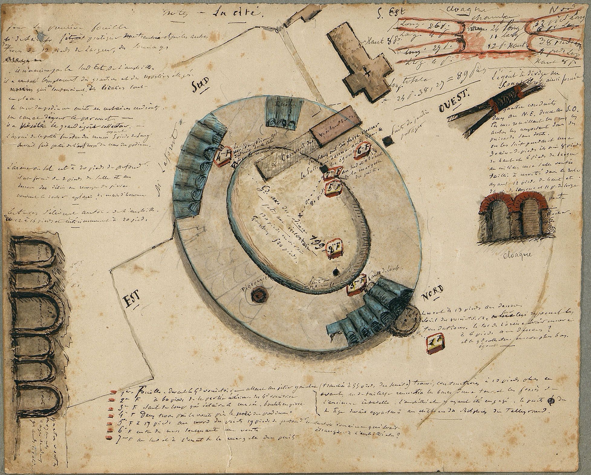 "...De ses passages à Périgueux il adresse deux rapports à l’Académie des Inscriptions et Belles Lettres, l’un pour ses séjours en 1763 et 1772, l’autre pour 1783. L’amphithéâtre y fait l’objet de quatre planches : une vue cavalière qui montre l’ensemble des vestiges, un plan simplifié, et deux restitutions de l’élévation, intérieure et extérieure."