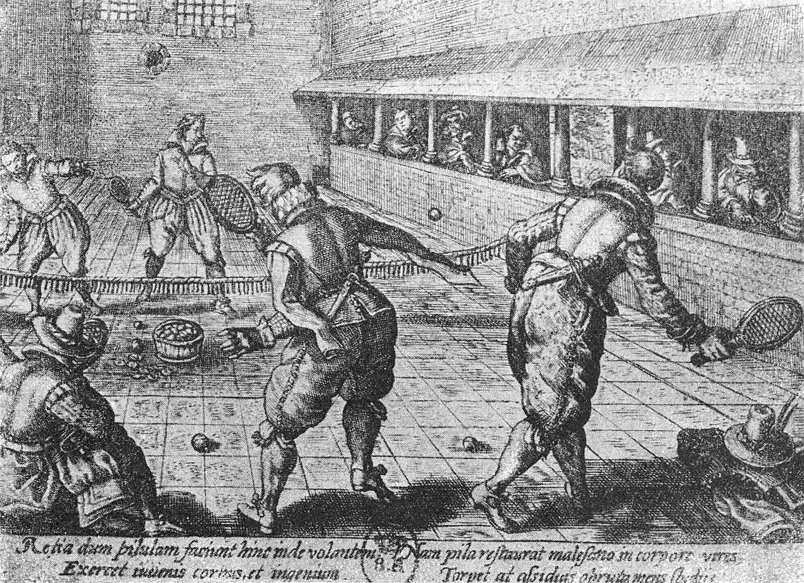 Très pratiqué sous l’Ancien Régime, le jeu de paume, mentionné par saint Augustin dans ses Confessions, existe au moins depuis l’Antiquité tardive. Il consiste à envoyer à l’adversaire une balle en tissu, appelée éteuf, avec la paume de la main. Afin de protéger la main, un gant de cuir est parfois utilisé, ou une raquette en bois appelée « battoir ». Au début du XVIe siècle, l’usage d’une raquette cordée de chanvre ou de boyau est introduit, mais on continue, plus rarement, de jouer à main nue, gantée ou avec un battoir.