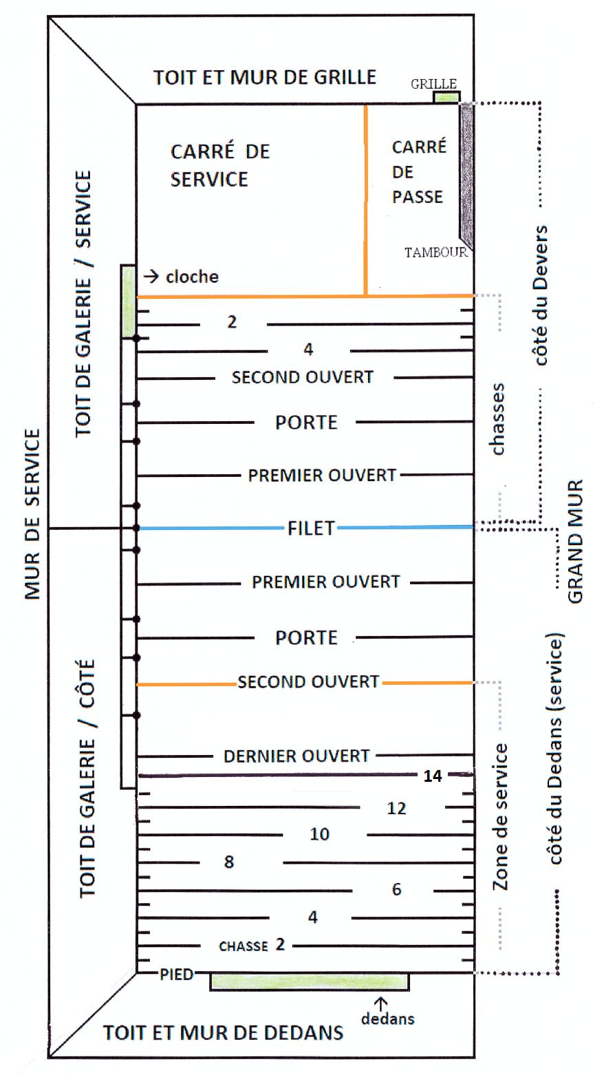 Le court fait entre 30 et 33 mètres de long sur 11 à 12 de large et 8 mètres de haut au minimum. Une galerie de 1,80 mètres de large longe trois côtés du terrain, et seul le grand mur reste lisse. Un filet, qui n’est pas tendu et mesure 91 cm au centre et 1,60 m sur les bords, sépare la surface de jeu appelée le carreau en deux parties : le côté du dedans qui est la surface où l’on sert, et le côté du devers qui est la partie qui reçoit le service.