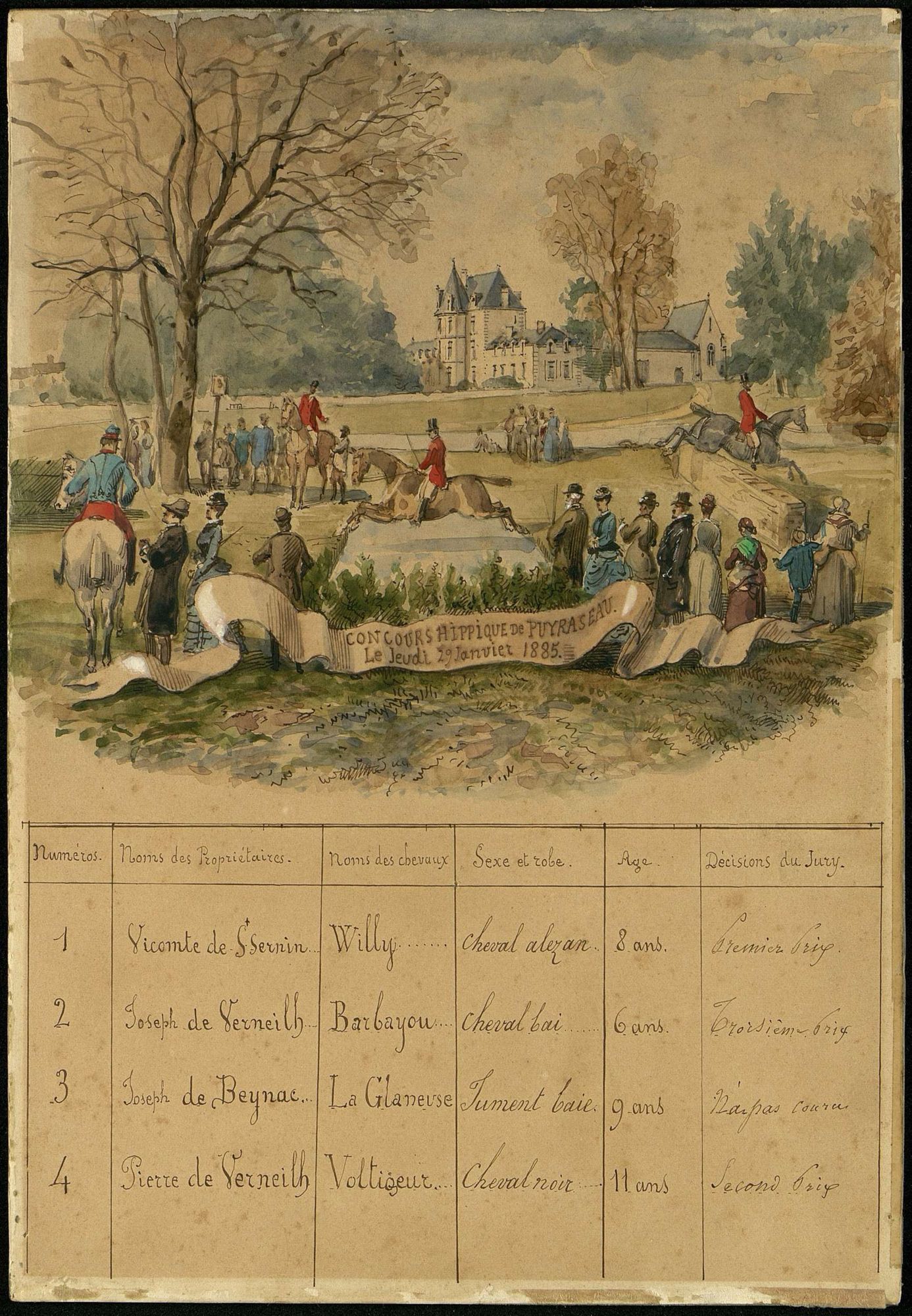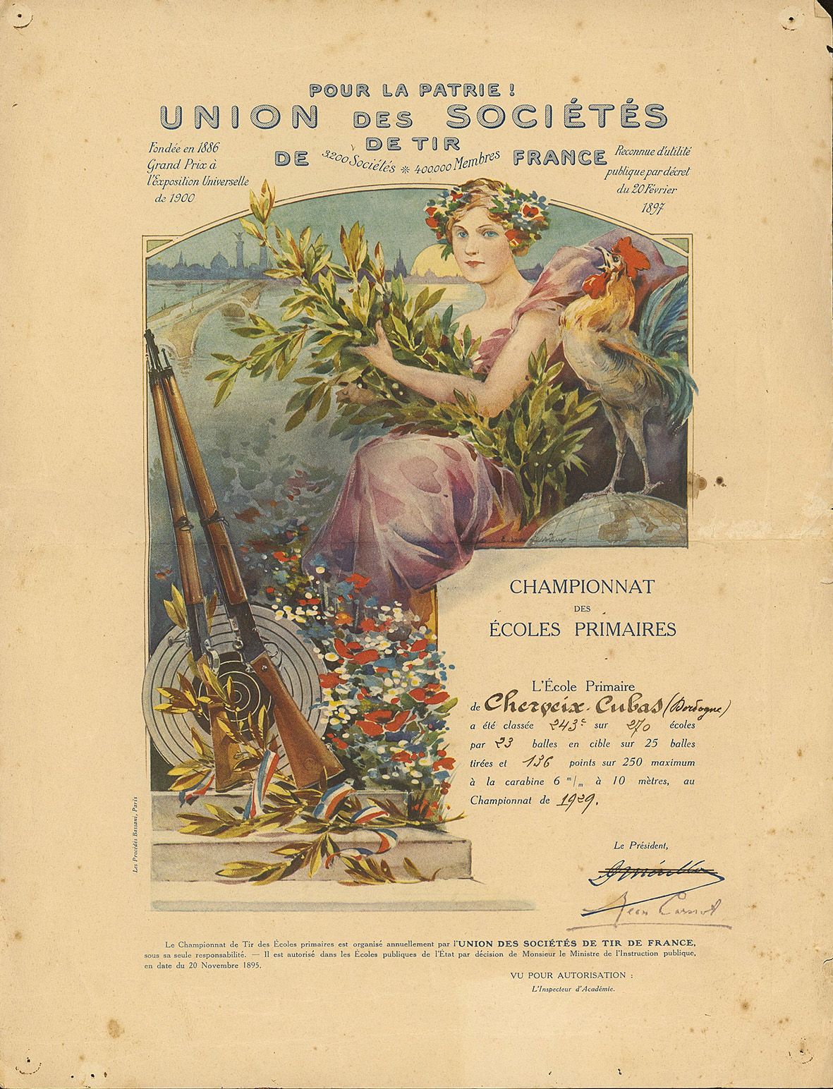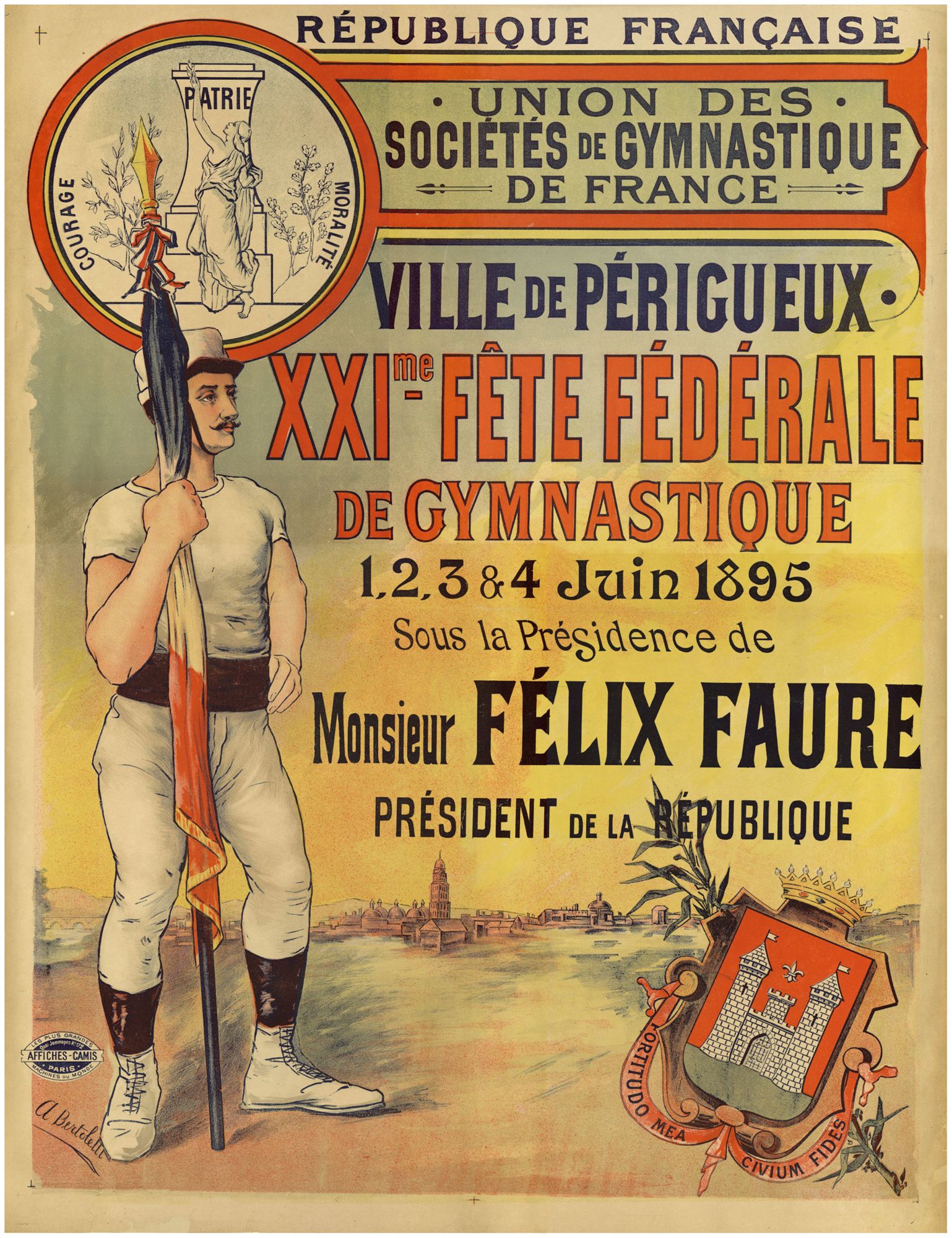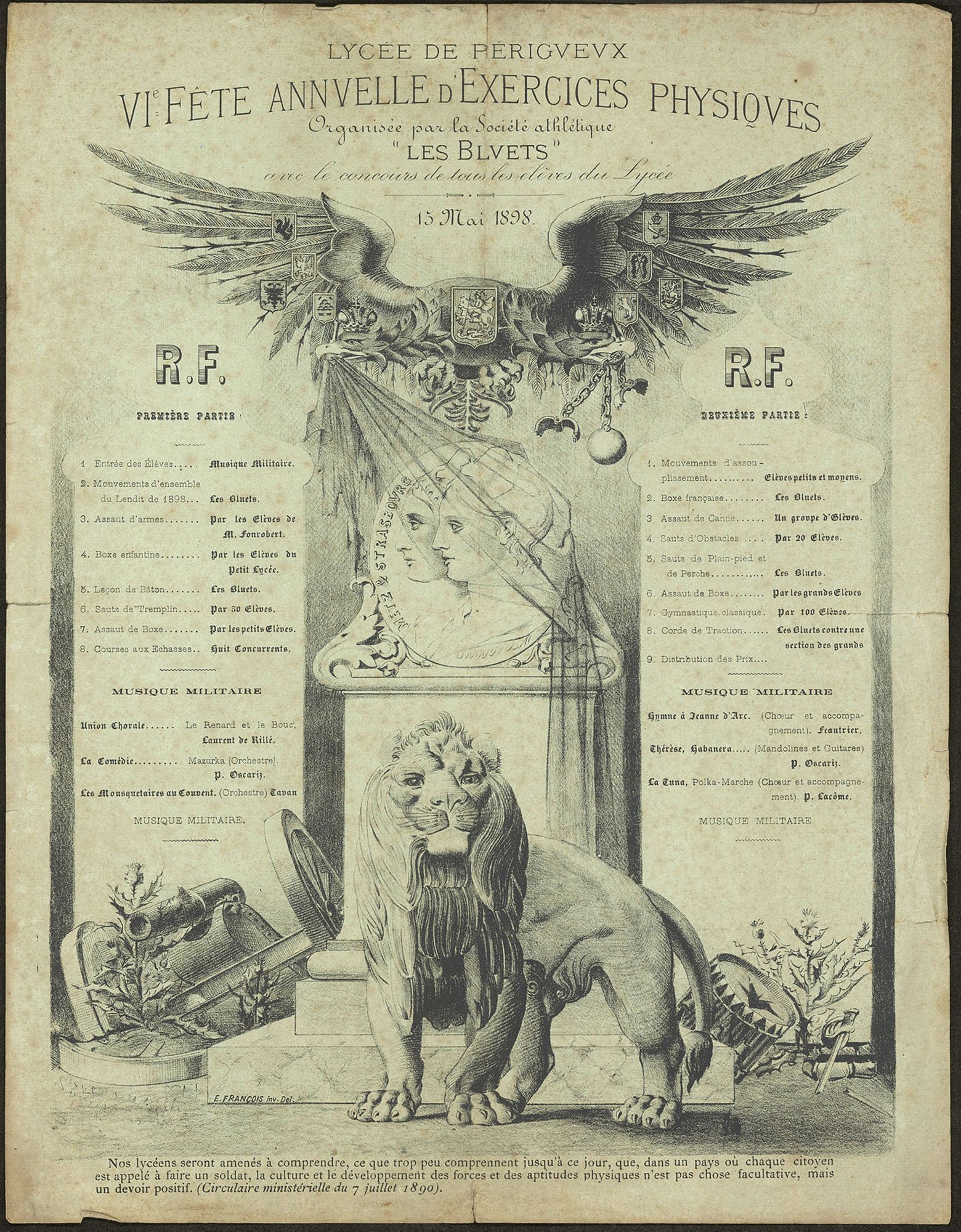 Cette affiche réalisée par E. François, professeur de dessin au lycée de Périgueux, témoigne du caractère militaire et revanchard de l’éducation sportive au lycée, suite à la défaite de la guerre de 1870. Le texte du bas de page renforce encore cette impression.