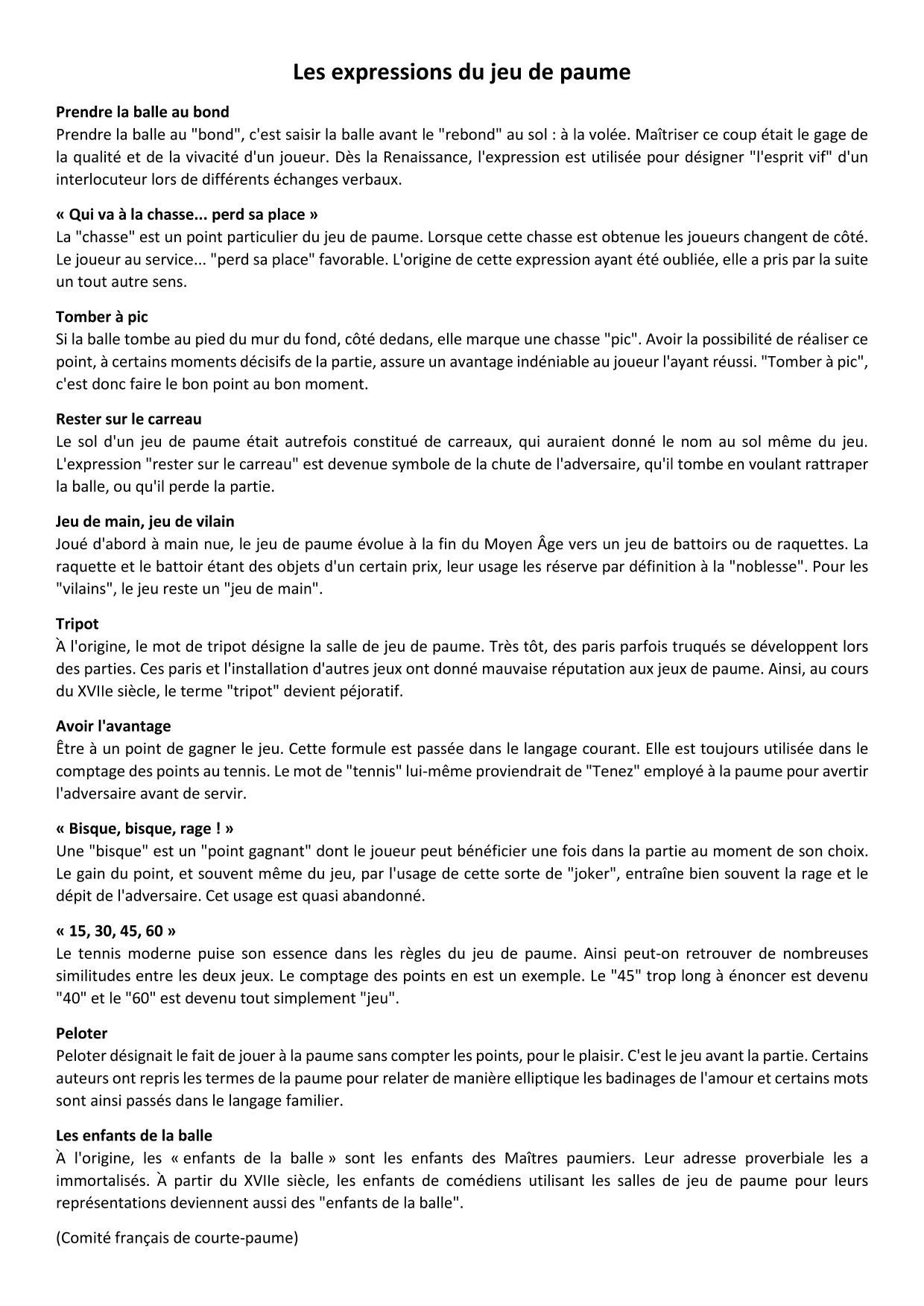 En raison de son succès et de la durée de sa pratique, le jeu de paume a laissé beaucoup d’expressions qui ont cours encore aujourd’hui.