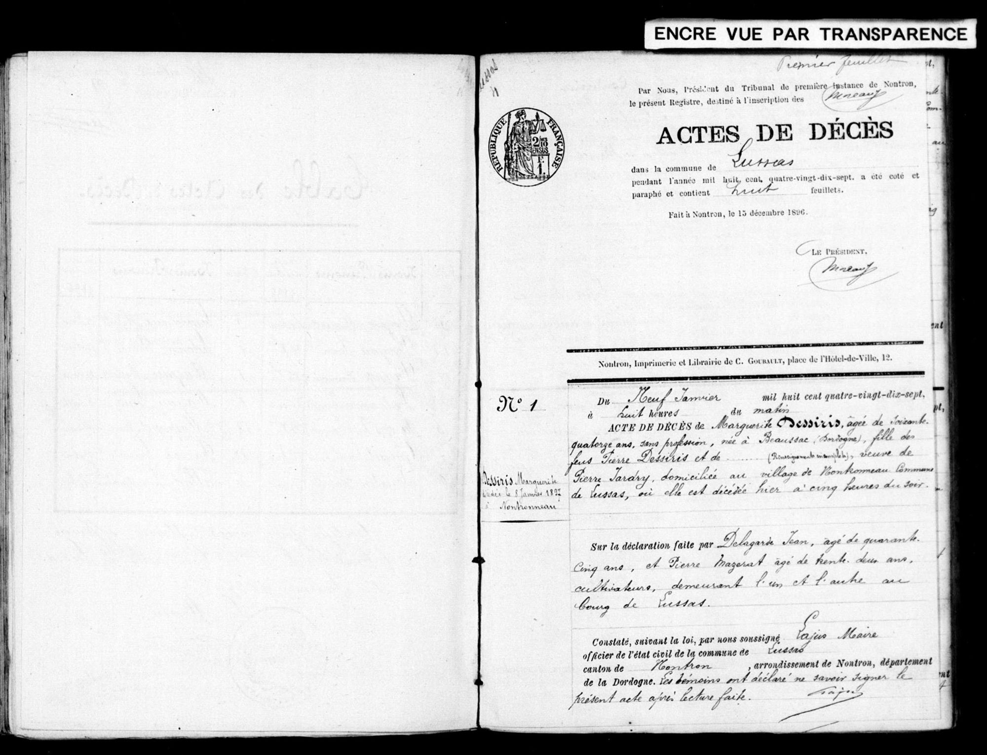 Collection Registres paroissiaux et d'état civil Lieux Lussas-et-Nontronneau (Dordogne, France) Cote 5 E 244/24 Titre Lussas-et-Nontronneau, Décès (1897) Date 1897 Type d'acte Décès
