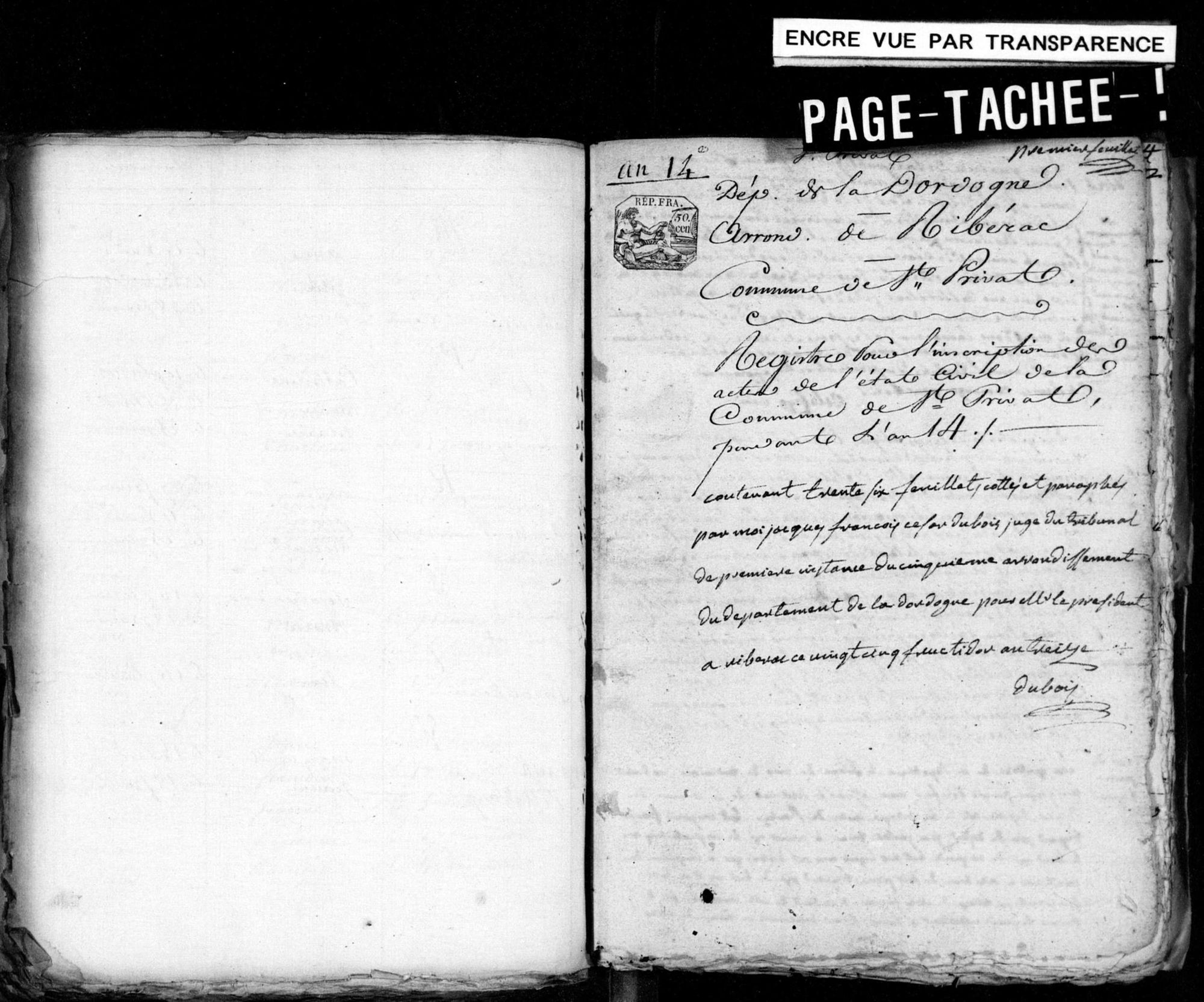 Collection Registres paroissiaux et d'état civil Lieux Saint-Privat-des-Prés (Dordogne, France) Cote 5 E 487/3 Titre Saint-Privat-des-Prés, Naissances Mariages Décès (An XIV) Date 1805 - 1806 Type d'acte Naissances Mariages Décès