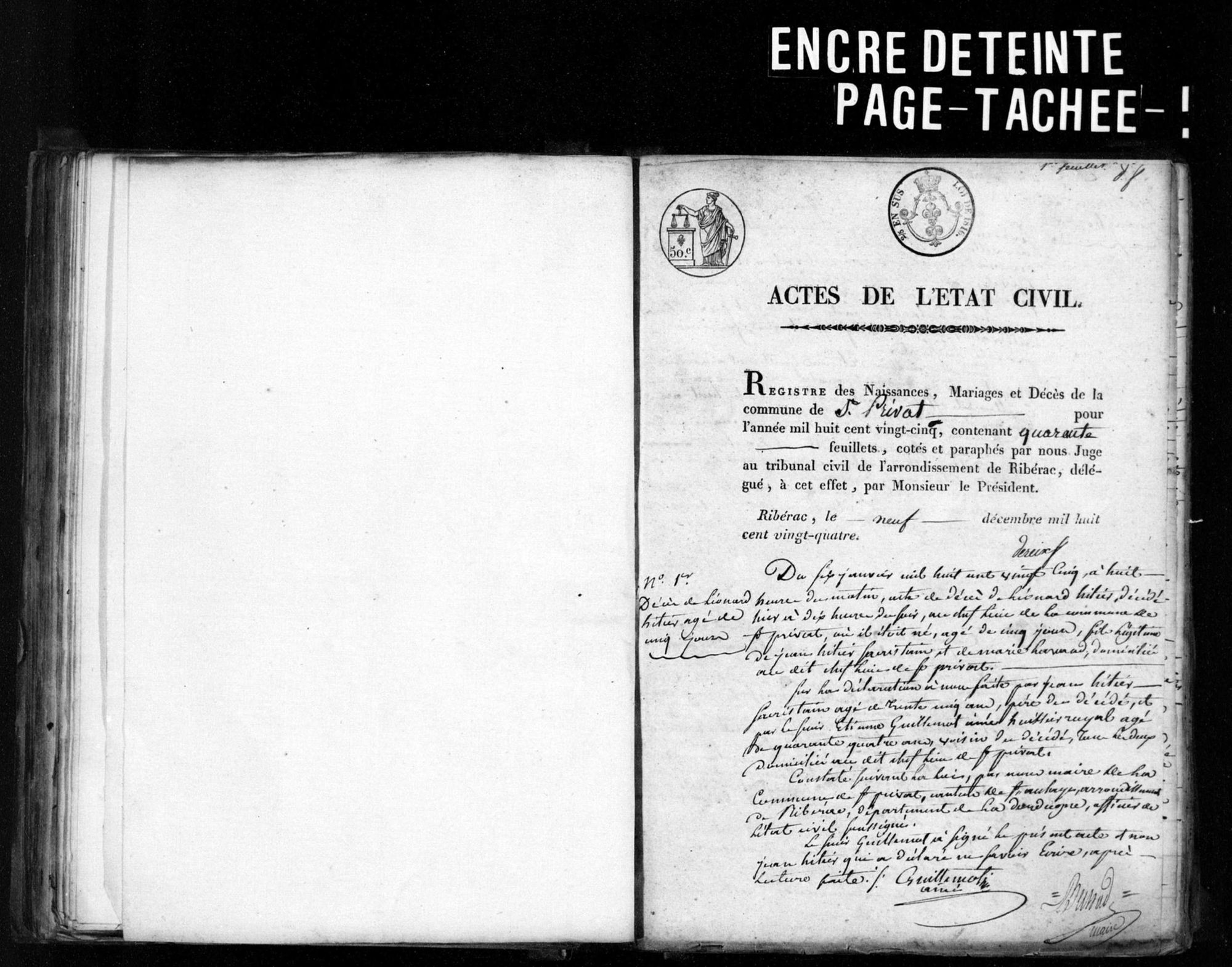 Collection Registres paroissiaux et d'état civil Lieux Saint-Privat-des-Prés (Dordogne, France) Cote 5 E 487/6 Titre Saint-Privat-des-Prés, Naissances Mariages Décès (1825) Date 1825 Type d'acte Naissances Mariages Décès