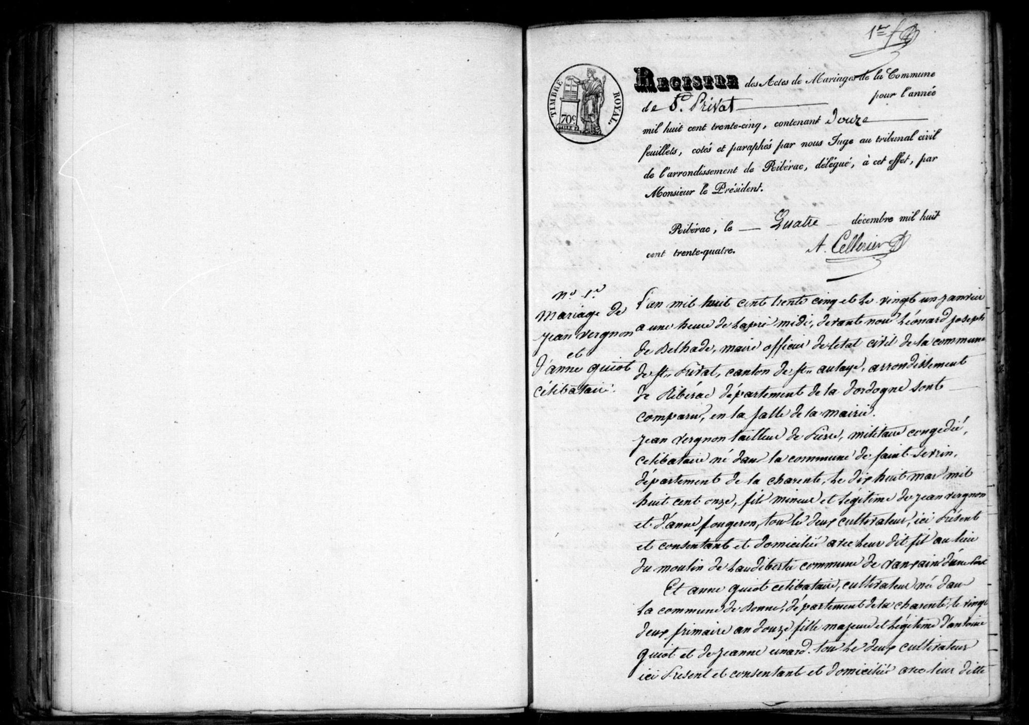 Collection Registres paroissiaux et d'état civil Lieux Saint-Privat-des-Prés (Dordogne, France) Cote 5 E 487/7 Titre Saint-Privat-des-Prés, Mariages (1835) Date 1835 Type d'acte Mariages