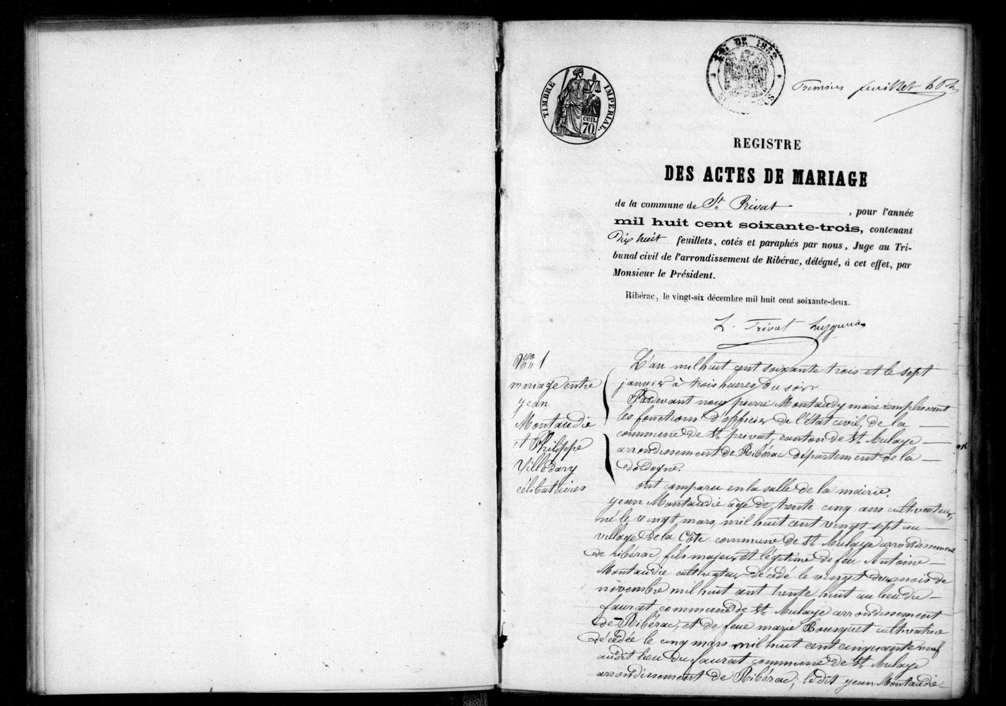 Collection Registres paroissiaux et d'état civil Lieux Saint-Privat-des-Prés (Dordogne, France) Cote 5 E 487/12 Titre Saint-Privat-des-Prés, Mariages (1863) Date 1863 Type d'acte Mariages