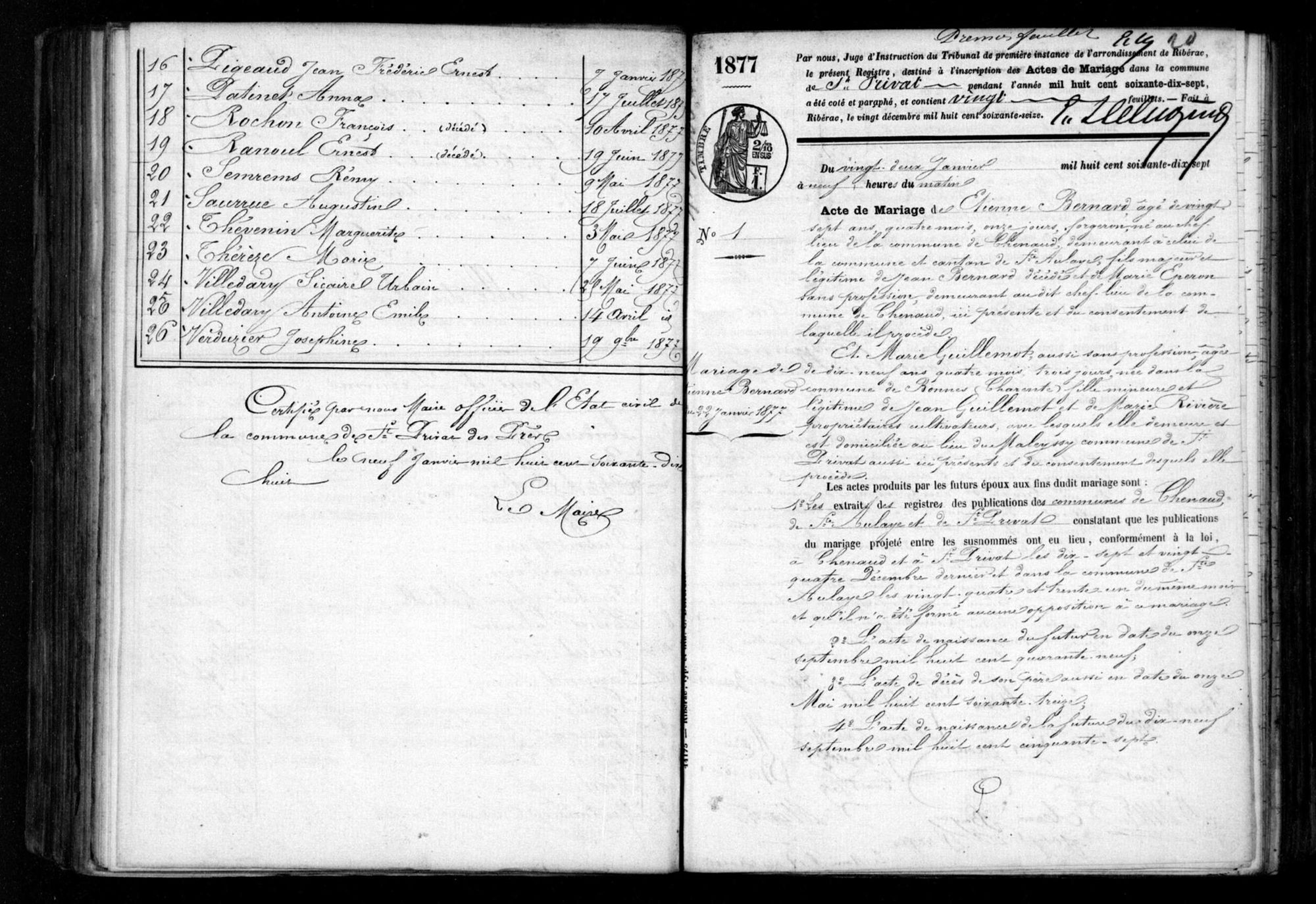 Collection Registres paroissiaux et d'état civil Lieux Saint-Privat-des-Prés (Dordogne, France) Cote 5 E 487/14 Titre Saint-Privat-des-Prés, Mariages (1877) Date 1877 Type d'acte Mariages
