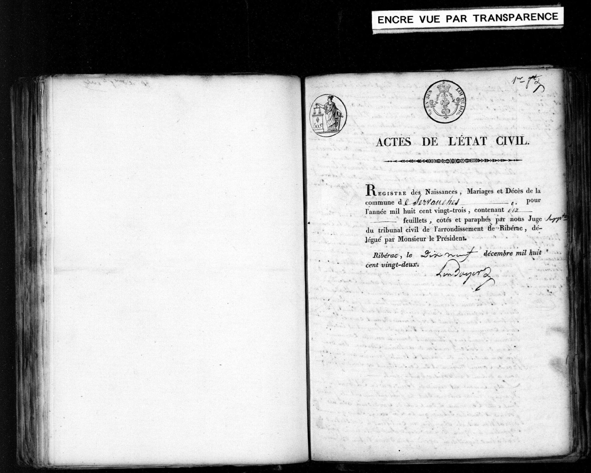 Collection Registres paroissiaux et d'état civil Lieux Servanches (Dordogne, France) Cote 5 E 527/4 Titre Servanches, Naissances Mariages Décès (1823) Date 1823 Type d'acte Naissances Mariages Décès