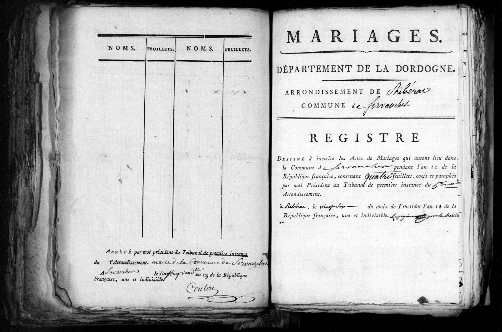 Collection Registres paroissiaux et d'état civil Lieux Servanches (Dordogne, France) Cote 5 E 527/3 Titre Servanches, Mariages (An XII) Date 1803 - 1804 Type d'acte Mariages
