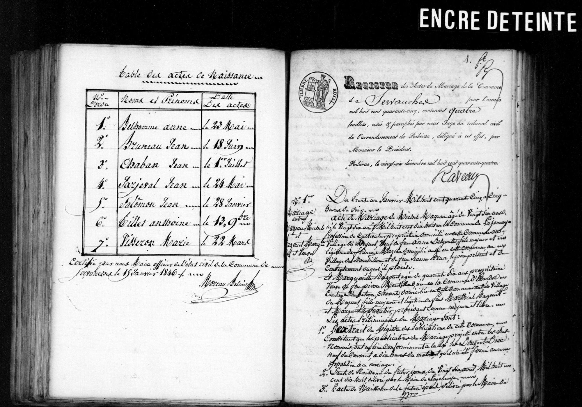 Collection Registres paroissiaux et d'état civil Lieux Servanches (Dordogne, France) Cote 5 E 527/5 Titre Servanches, Mariages (1845) Date 1845 Type d'acte Mariages