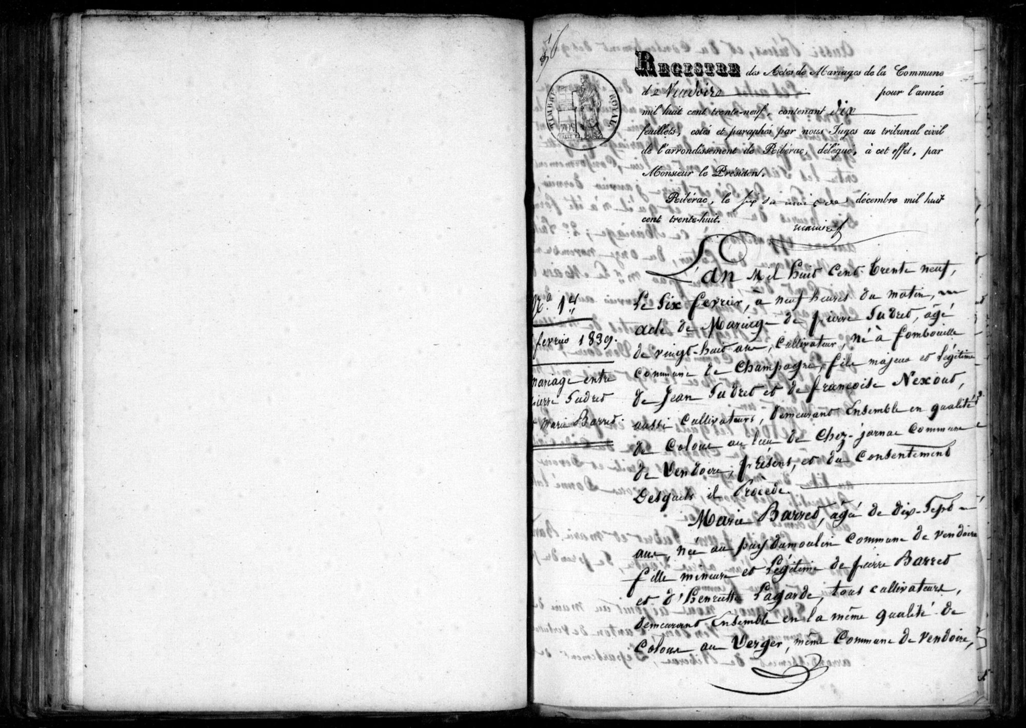Collection Registres paroissiaux et d'état civil Lieux Vendoire (Dordogne, France) Cote 5 E 562/5 Titre Vendoire, Mariages (1839) Date 1839 Type d'acte Mariages