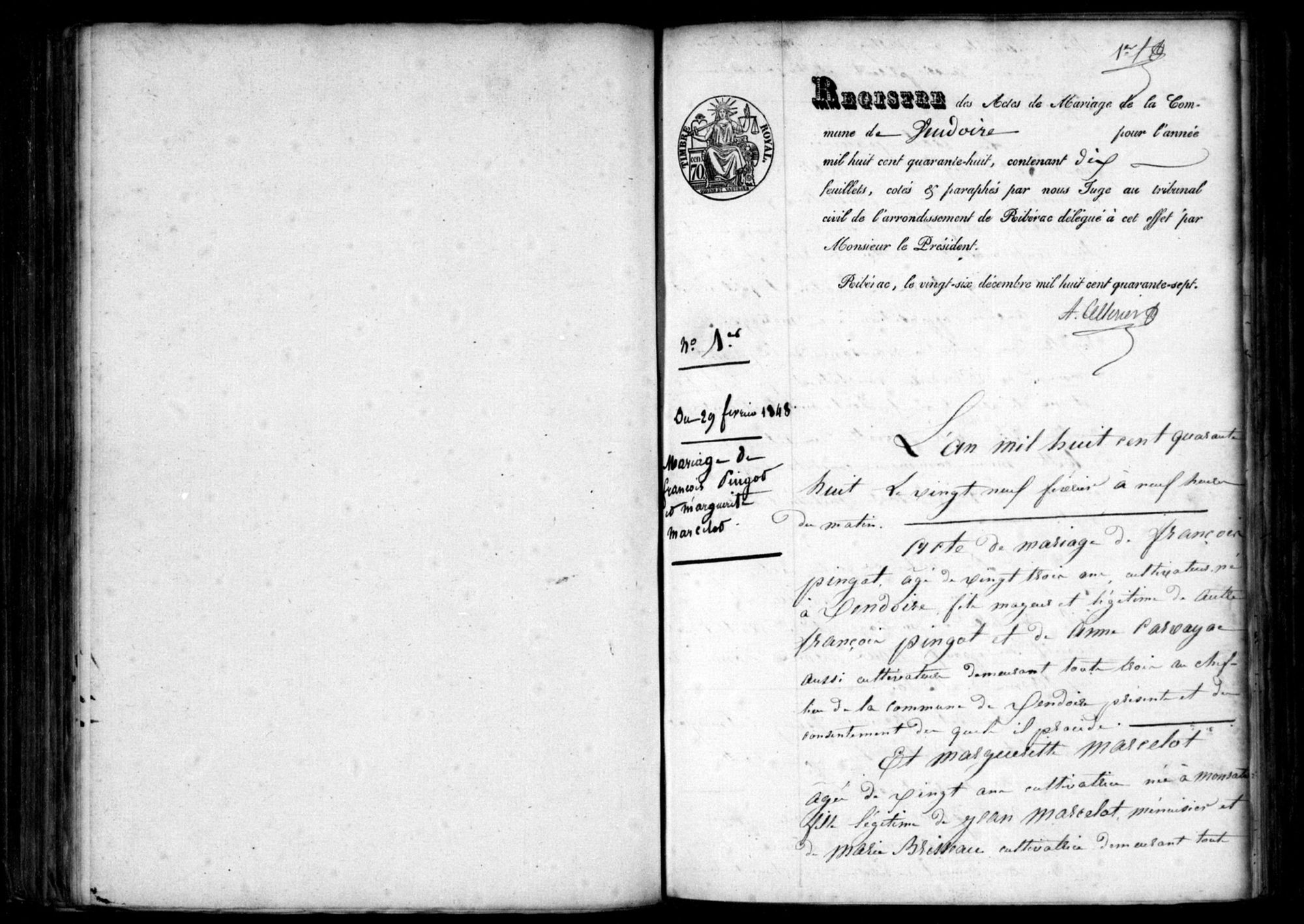 Collection Registres paroissiaux et d'état civil Lieux Vendoire (Dordogne, France) Cote 5 E 562/6 Titre Vendoire, Mariages (1848) Date 1848 Type d'acte Mariages