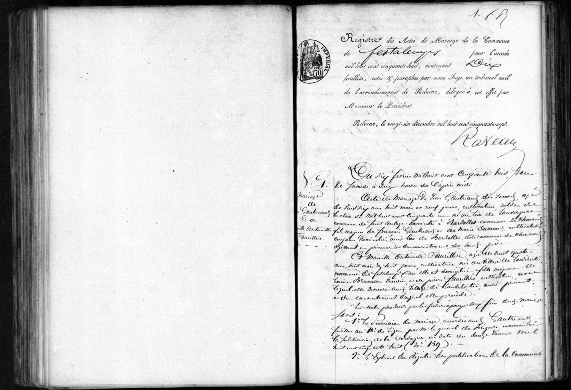 Collection Registres paroissiaux et d'état civil Lieux Festalemps (Dordogne, France) Cote 5 E 176/9 Titre Festalemps, Mariages (1858) Date 1858 Type d'acte Mariages