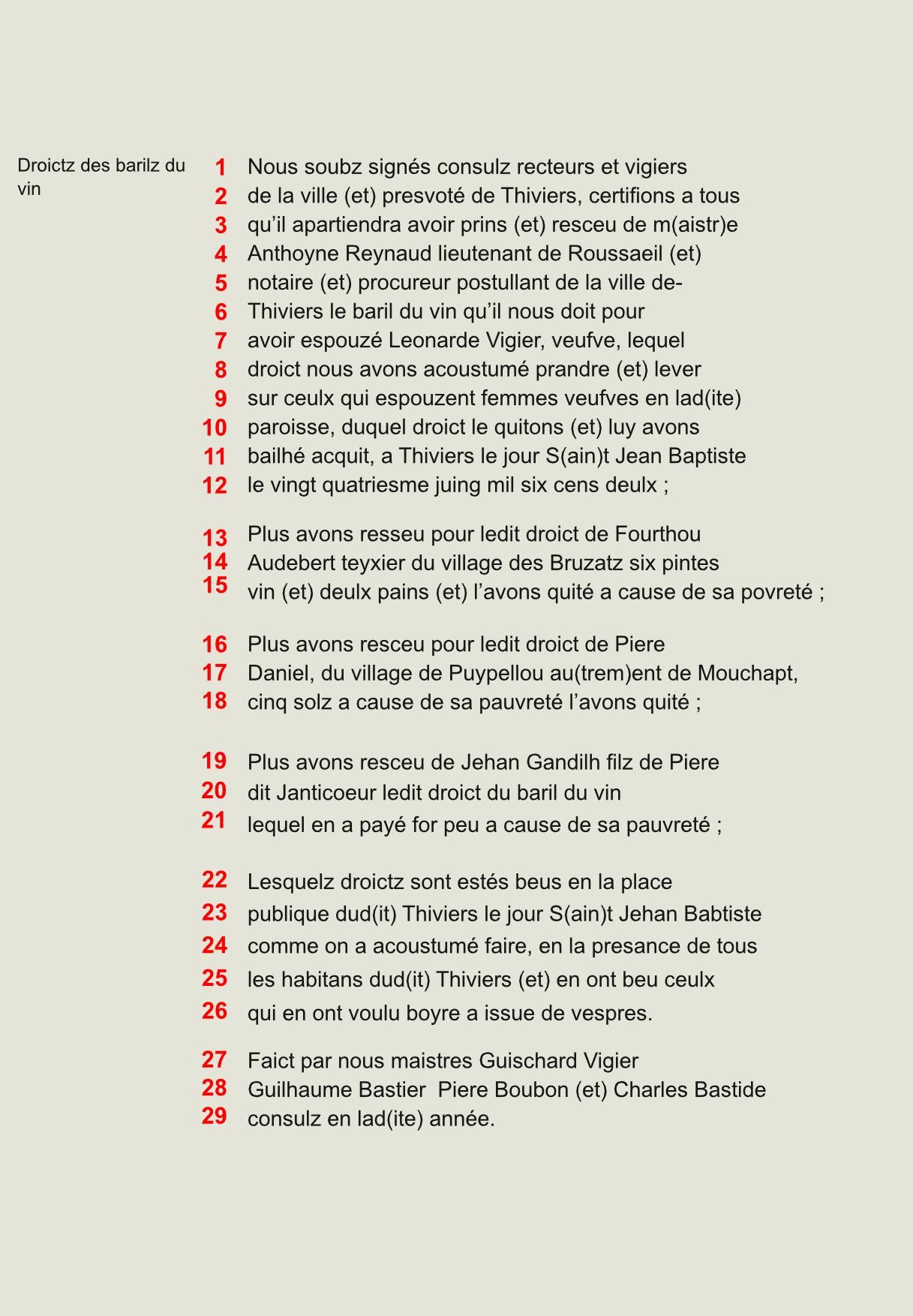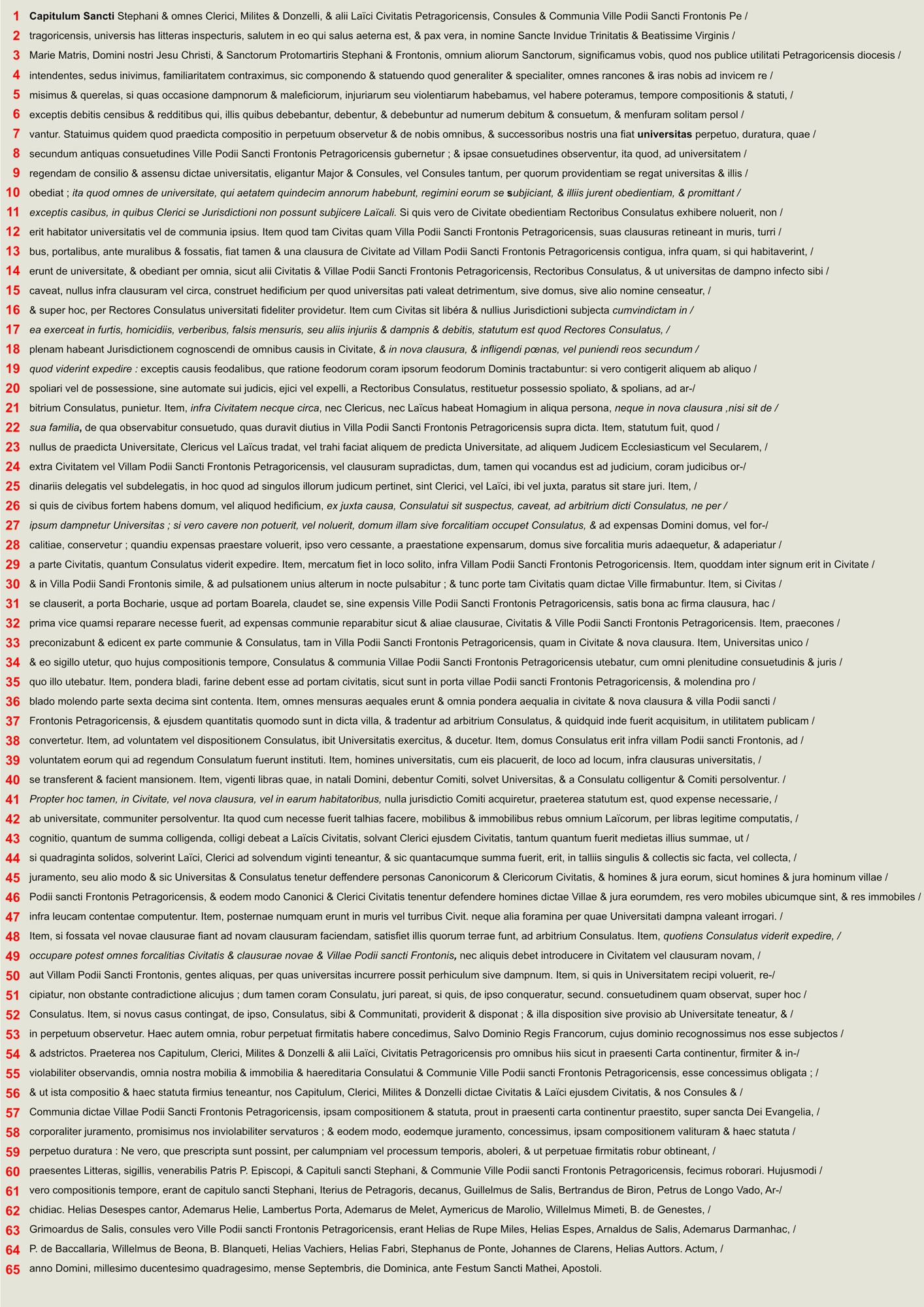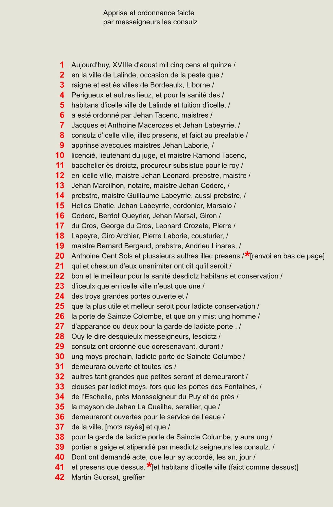 Vie municipale Traité d'union de la Cité et du Puy-Saint-Front de Périgueux, 1240 (latin - transcription et traduction) ** Election des consuls de Lalinde, 1535 ** Mesures contre la peste à Lalinde, 1515 *** Mesures contre les soldats maraudeurs, Sarlat, 1592 * Droit des barils de vin à Thiviers, 1602 * Traité d'union de la Cité et du Puy-Saint-Front de Périgueux, 1240(1 / 6) Election des consuls de Lalinde, 1535 ** 3 Mesures contre la peste à Lalinde, 1515 *** 5 Droit des barils de vin à Thiviers, 1602