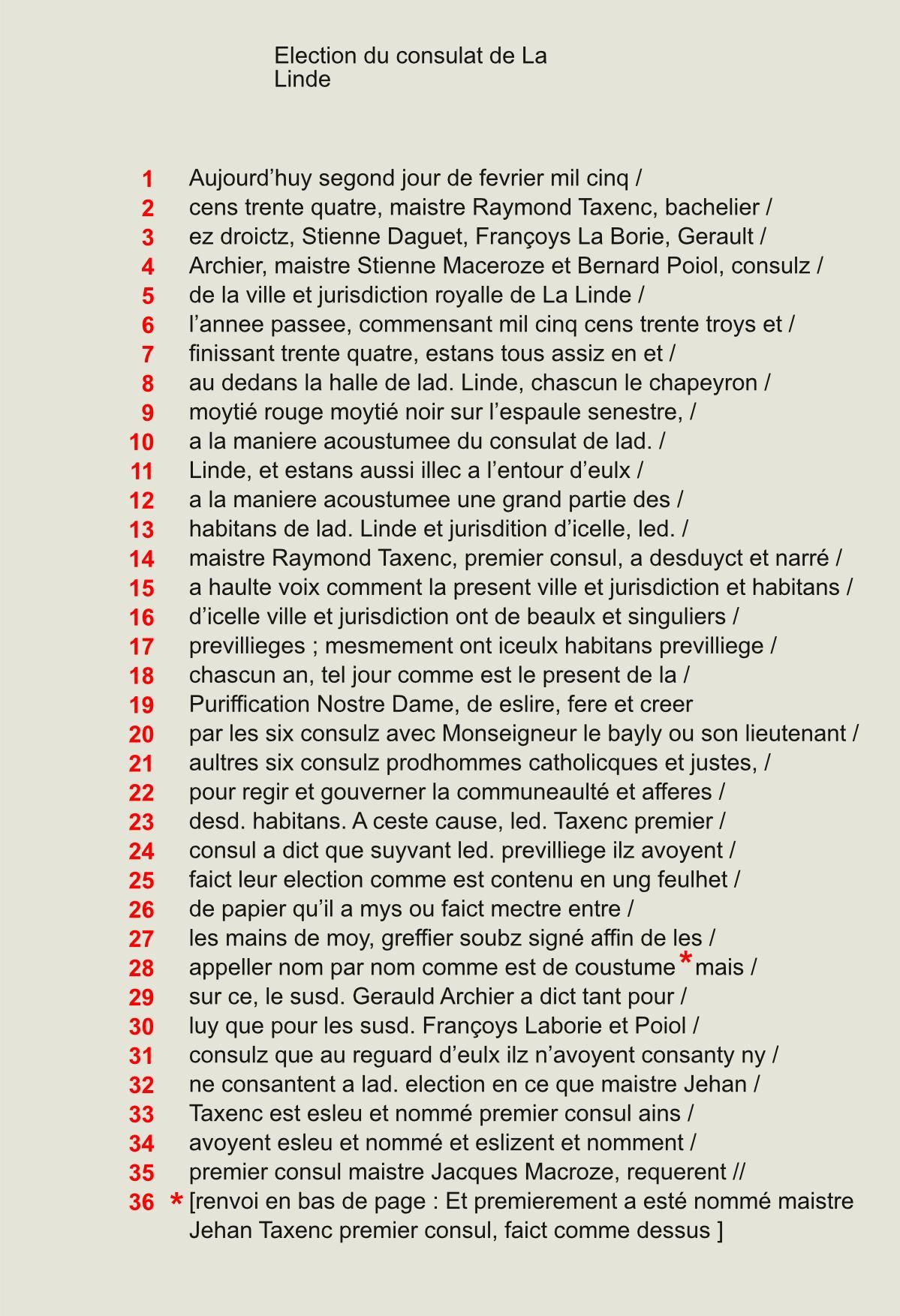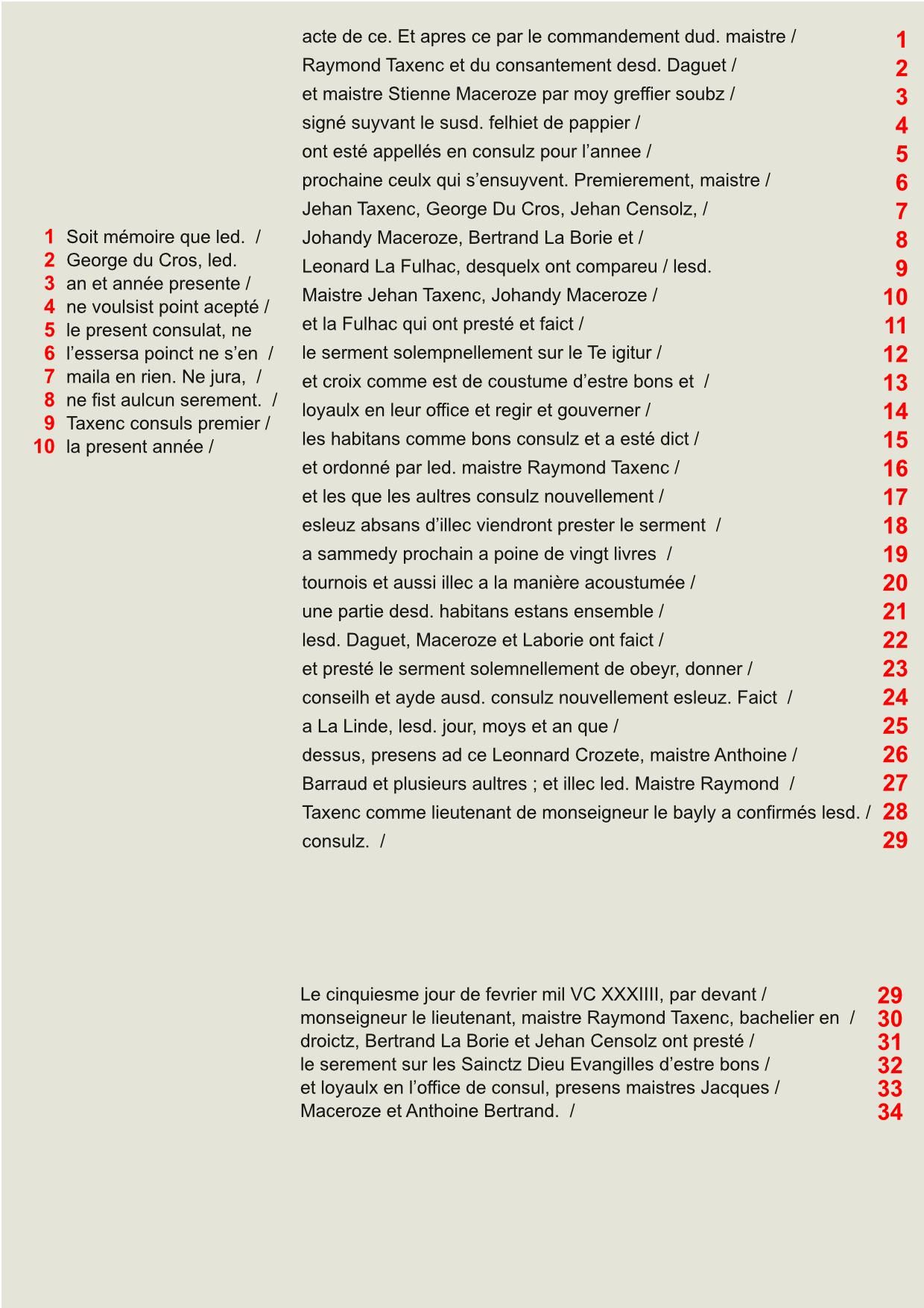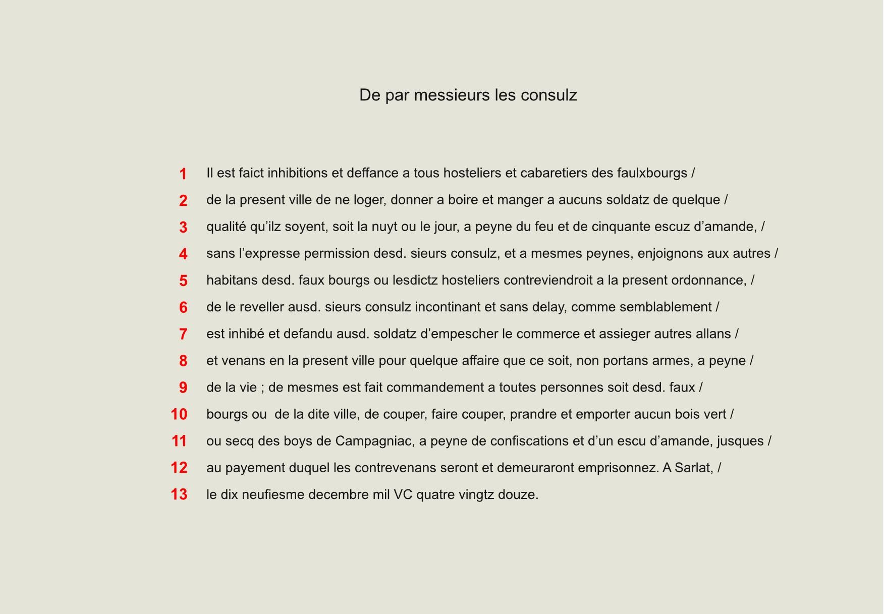 Vie municipale Traité d'union de la Cité et du Puy-Saint-Front de Périgueux, 1240 (latin - transcription et traduction) ** Election des consuls de Lalinde, 1535 ** Mesures contre la peste à Lalinde, 1515 *** Mesures contre les soldats maraudeurs, Sarlat, 1592 * Droit des barils de vin à Thiviers, 1602 * Traité d'union de la Cité et du Puy-Saint-Front de Périgueux, 1240(1 / 6) Election des consuls de Lalinde, 1535 ** 3 Mesures contre la peste à Lalinde, 1515 *** 5 Droit des barils de vin à Thiviers, 1602