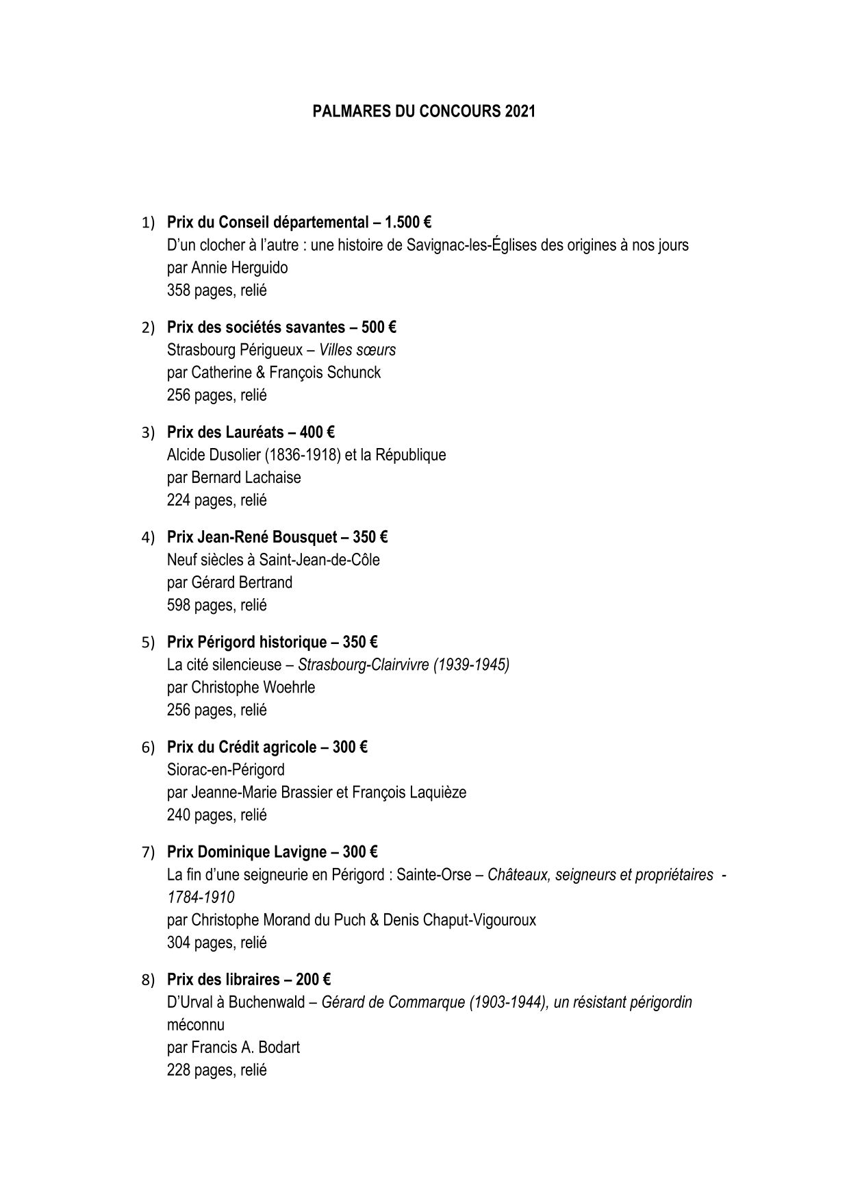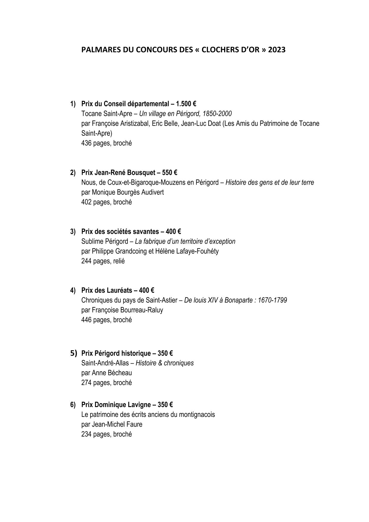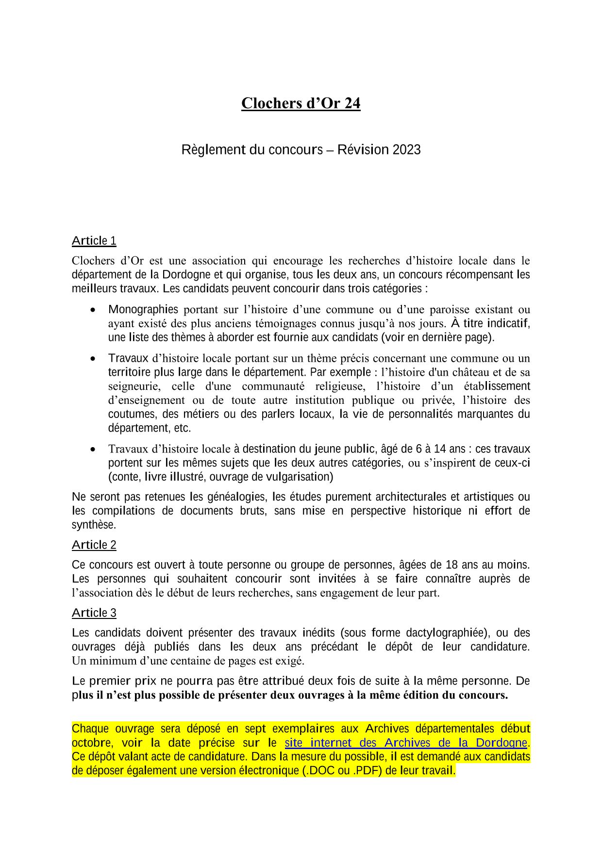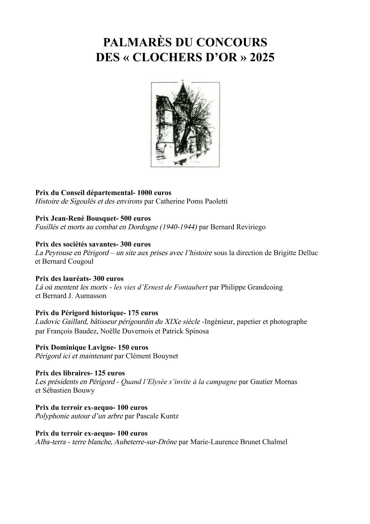 "Clochers d’Or 24" est une association qui encourage les recherches d’histoire locale dans le département de la Dordogne et qui organise, tous les deux ans, un concours récompensant les meilleurs travaux. Les candidats peuvent concourir dans trois catégories :
