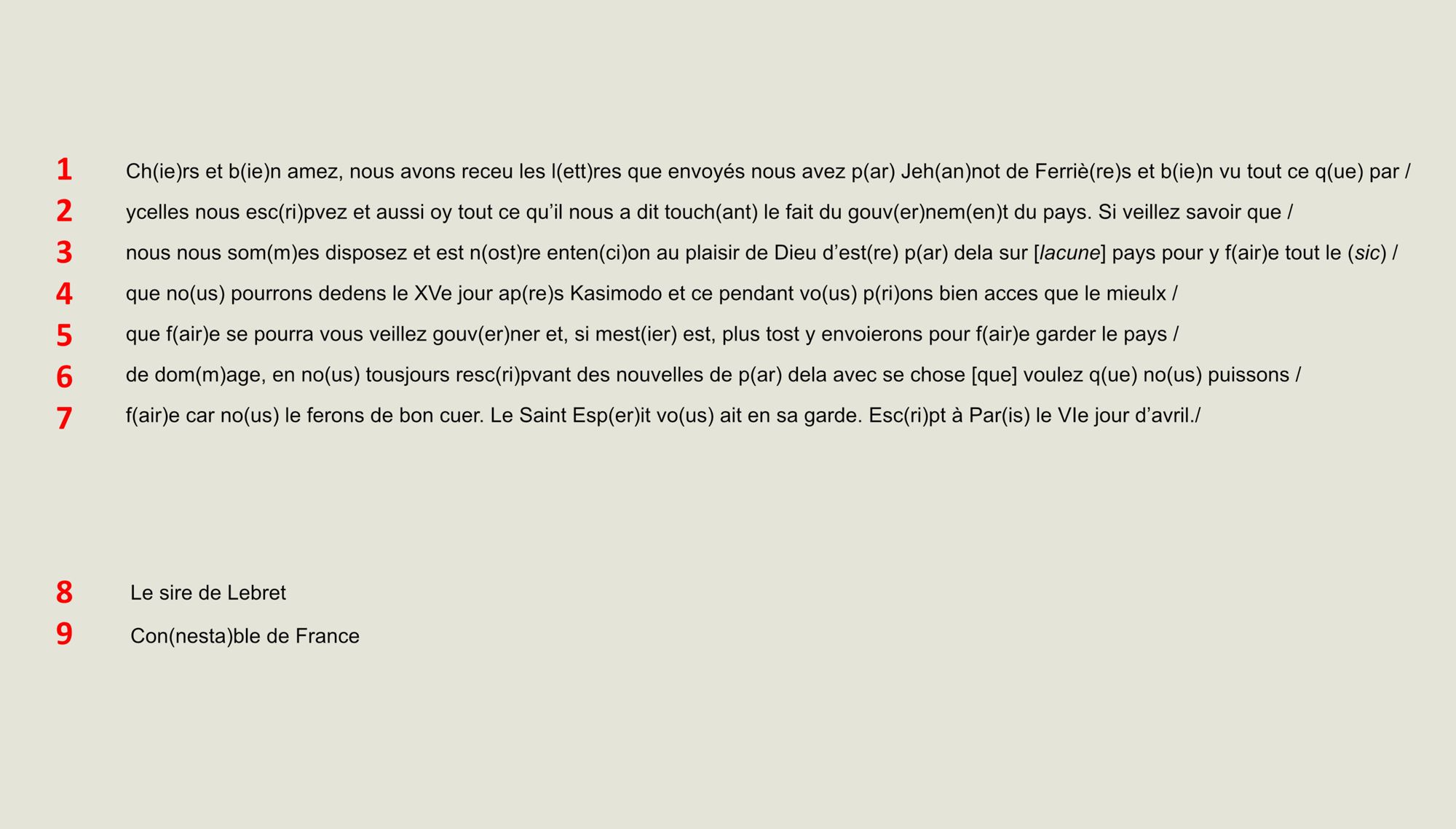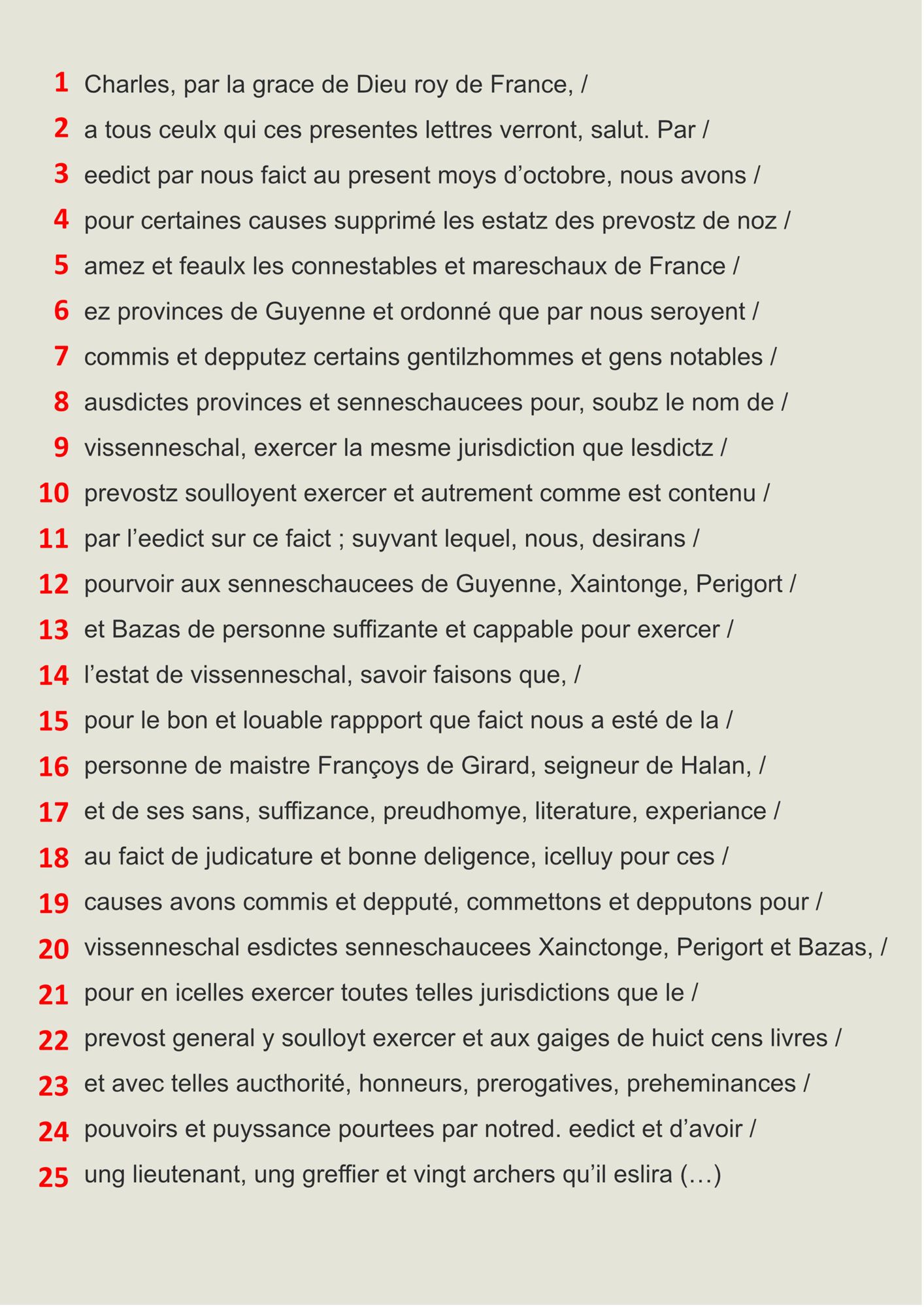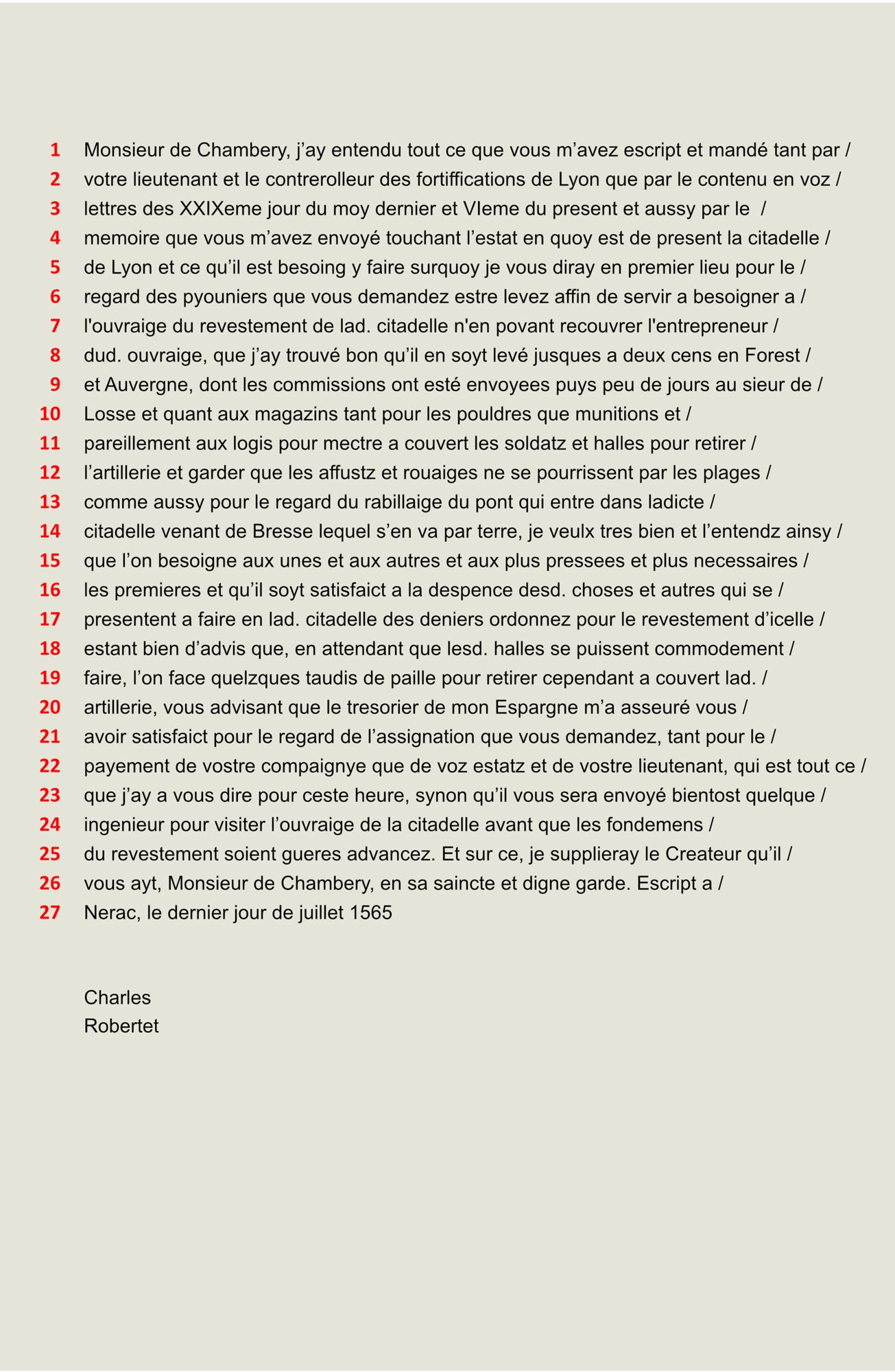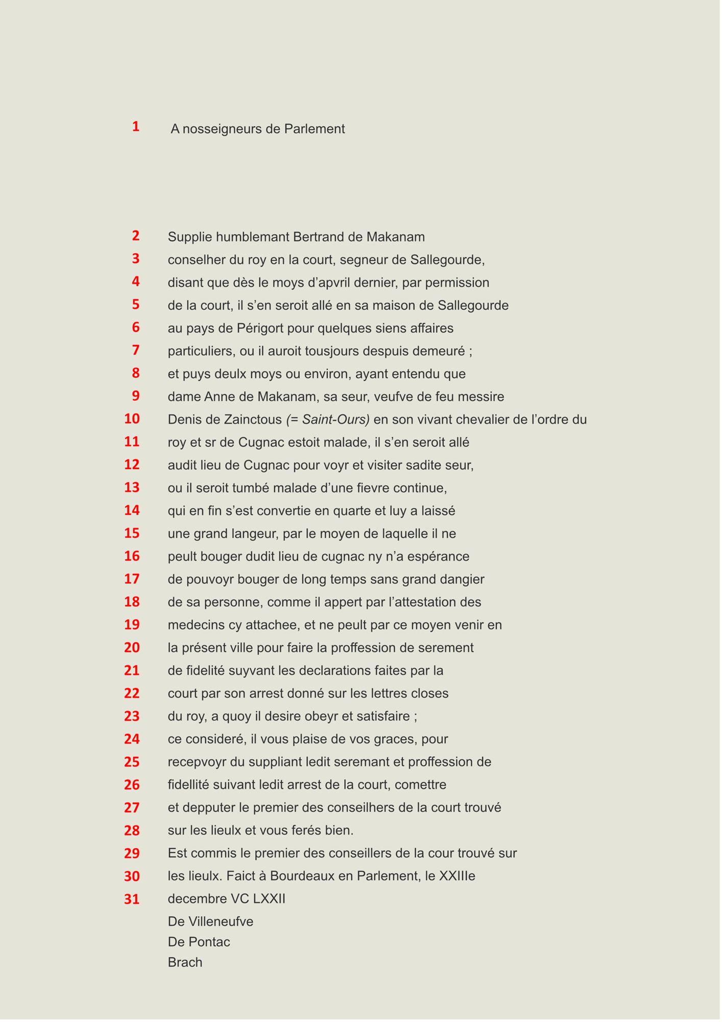 Vie politique Niveau débutant * (1/2) - Hommage rendu à Alain d'Albret pour des biens dans la chatellenie de Montignac, 1464. 2 E 1828/14 p.13 Niveau débutant * (2/2) - Serment de fidélité au roi, 1572. 2 E 1850/38-2 Niveau intermédiaire ** (1/3) - Nomination d'un vice-sénéchal par Charles IX. B 3544 p. 332 Niveau Intermédiaire ** (2/3) - Lettre du connétable de France aux consuls de Sarlat, XVe siècle. 4 E 125/7 pièce 11 Niveau intermédiaire ** (3/3) - Lettre du roi Charles IX à Monsieur de Chambéry concernant la citadelle de Lyon, 1565. 2 E 1836/59 p. 12 1 / 5