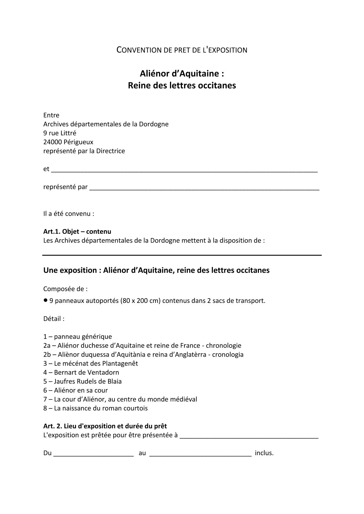 Établissement d’une convention de prêt entre les Archives départementales et l’organisateur.